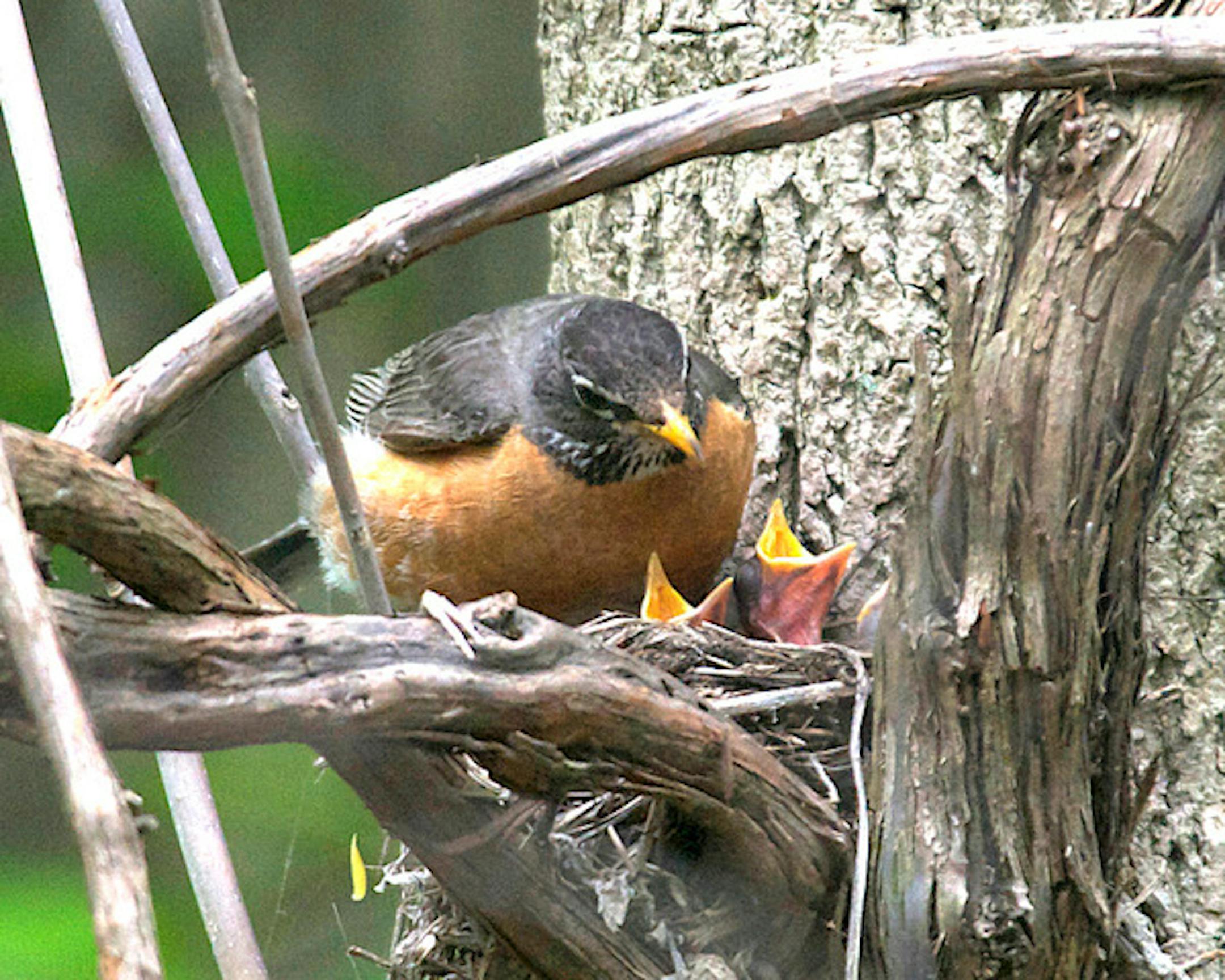 Here's another astonishing thing about nesting season: Every bird builds the kind of nest that's particular to its species but they've never seen one being built. Think of the robins' mud-based cup and the wrens' jumble of twigs. No one showed robins how to gather mud and tamp it down the first time they make a nest. And no older wren showed a young male wren how to gather hundreds of twigs to stuff into a tree hole or nest box.