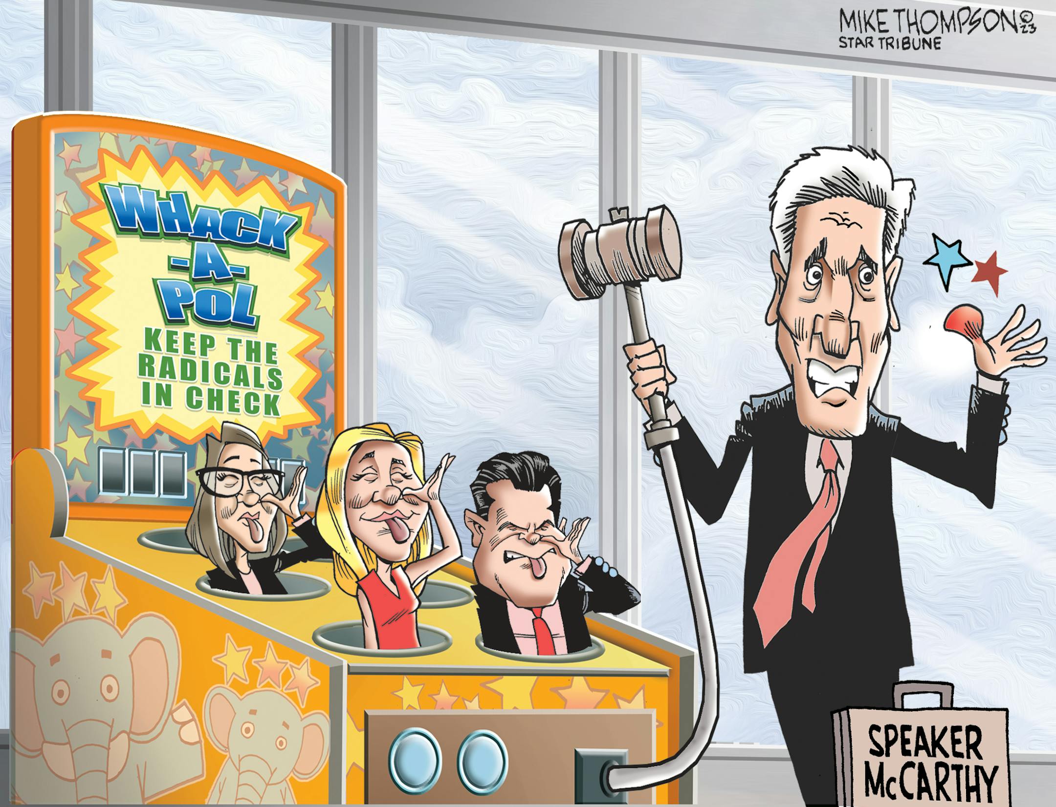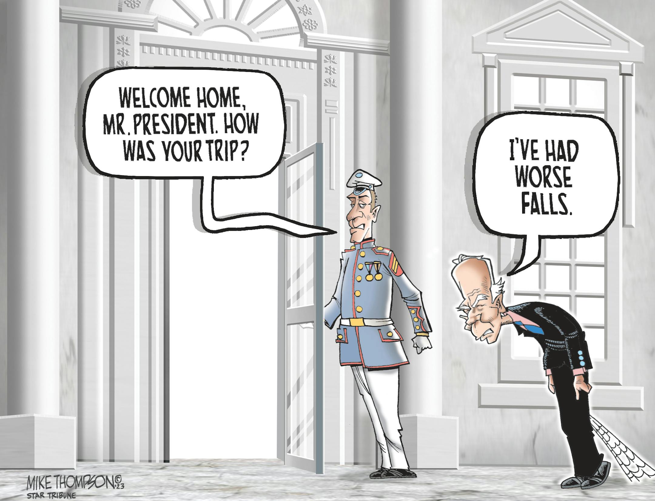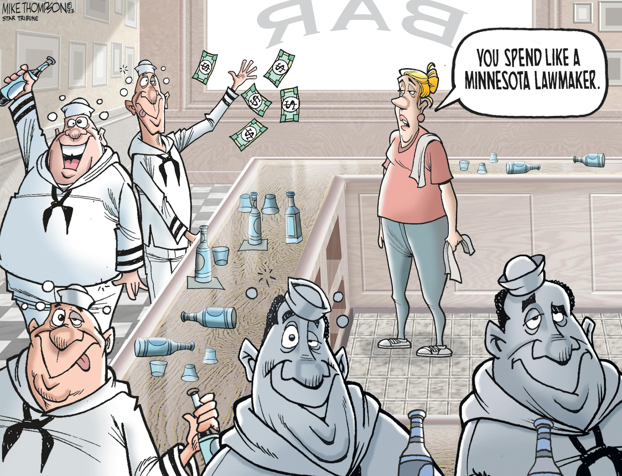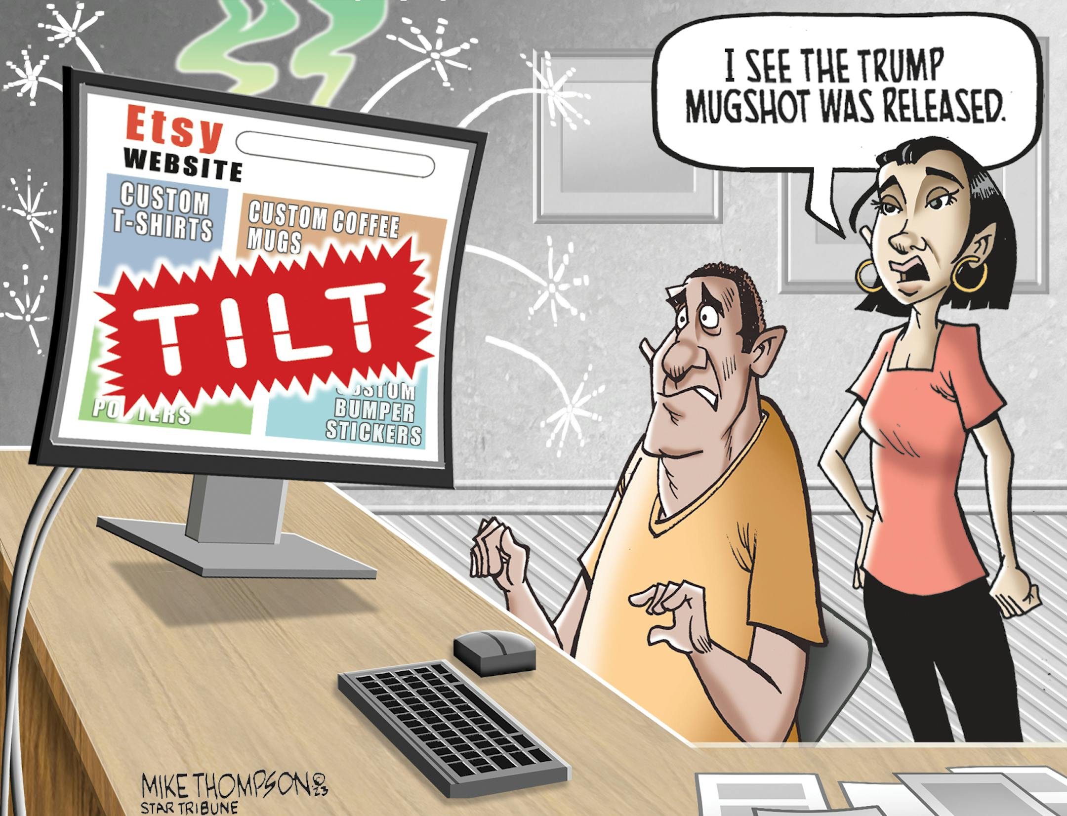 I had a cartoon in progress when news of additional charges in Trump's indictment in the Mar-a-Lago investigation broke Thursday evening. As often happens, I had to switch gears and start on a different idea. I have a graveyard of half-completed cartoons that I abandoned when big news broke or the story changed in the middle of working on a cartoon. I generally use Photoshop to build the backgrounds of my cartoons, draw the figures the old-fashioned way, then scan them into my laptop and color them. Here's a copy of where I left off. Maybe I'll be able to finish it for use next week — barring another Trump indictment.
