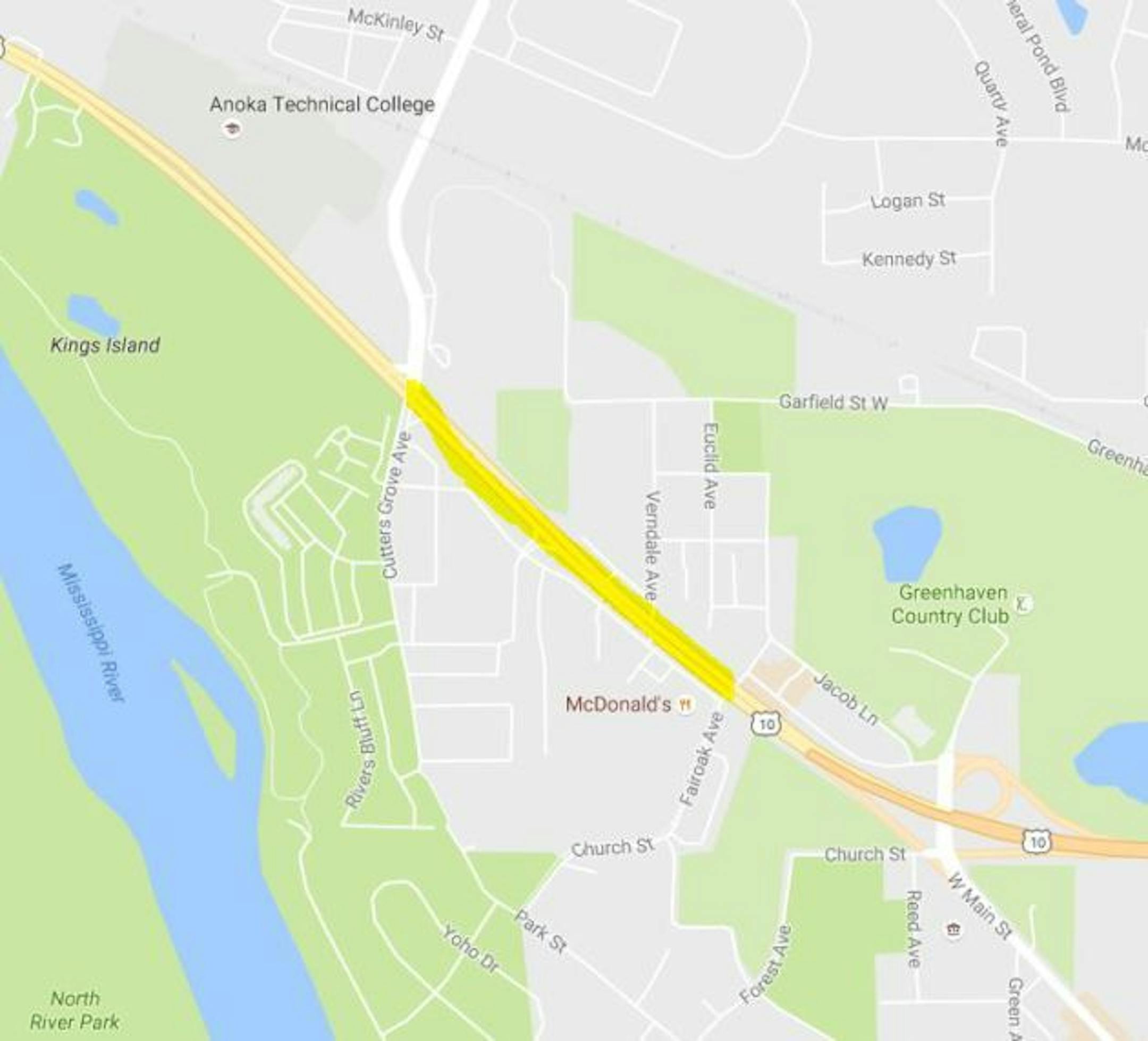 The $1.1 million project led by Anoka County is aimed at discouraging pedestrians from crossing in the middle of the block and to use crosswalks at signalized intersections. It also includes a new sidewalk between Fairoak Avenue and Main Street that is compliant with Americans with Disabilities Act standards and a bicycle and pedestrian path along the north side of Hwy. 10 between Verndale Avenue and Fairoak Avenue.