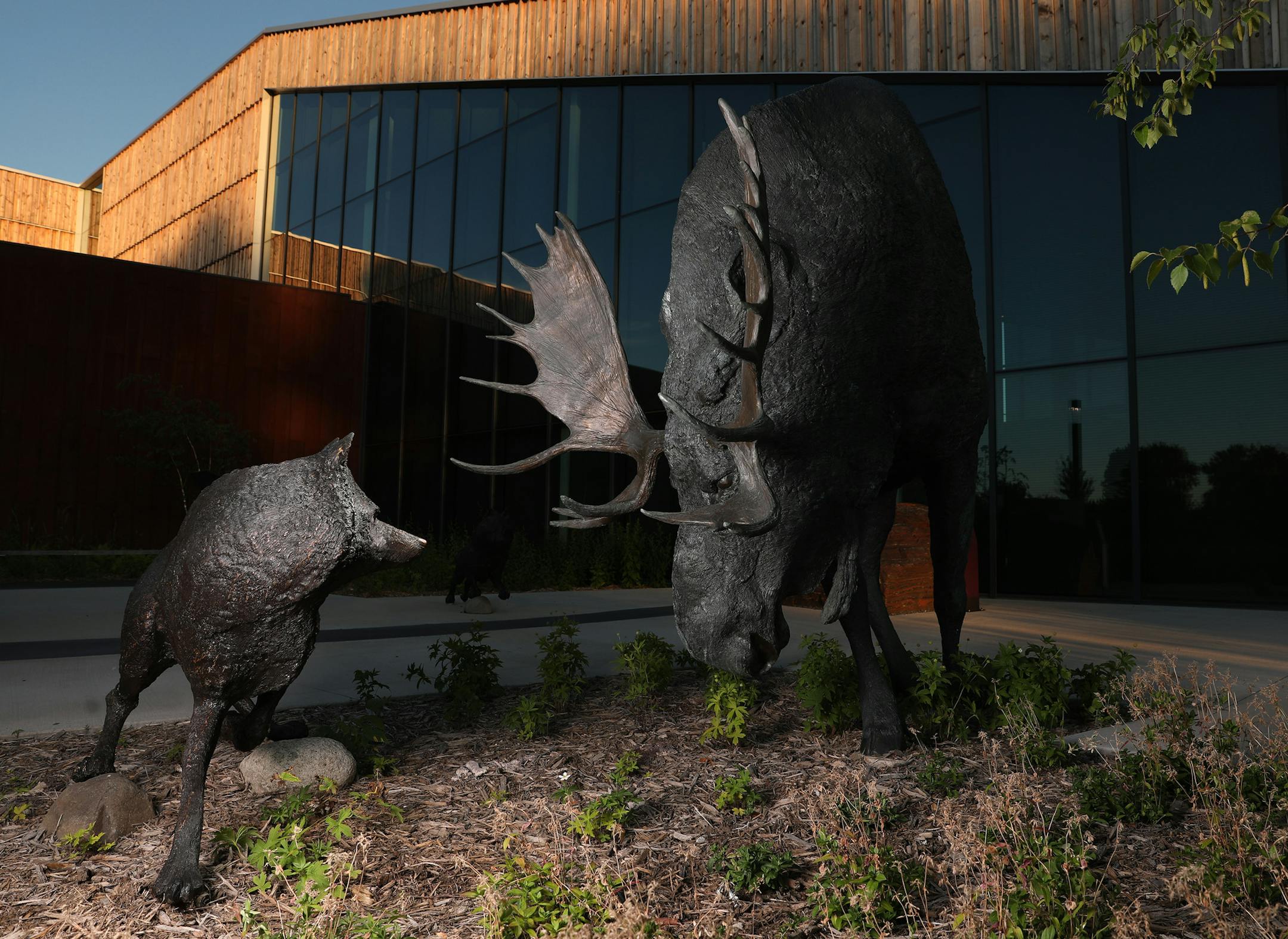 Three wolves move in on a giant moose in "The Encounter," a multipart bronze sculpture created in 1999 by artist Ian Dudley. In actuality, wolves wouldn't be able to kill a moose that large, said Bell communications manager Andria Waclawski. For its reinstallation outside the new Bell, Dudley added three ravens to the mix. These birds often follow wolves, waiting until they can scavenge the carcasses of their prey.