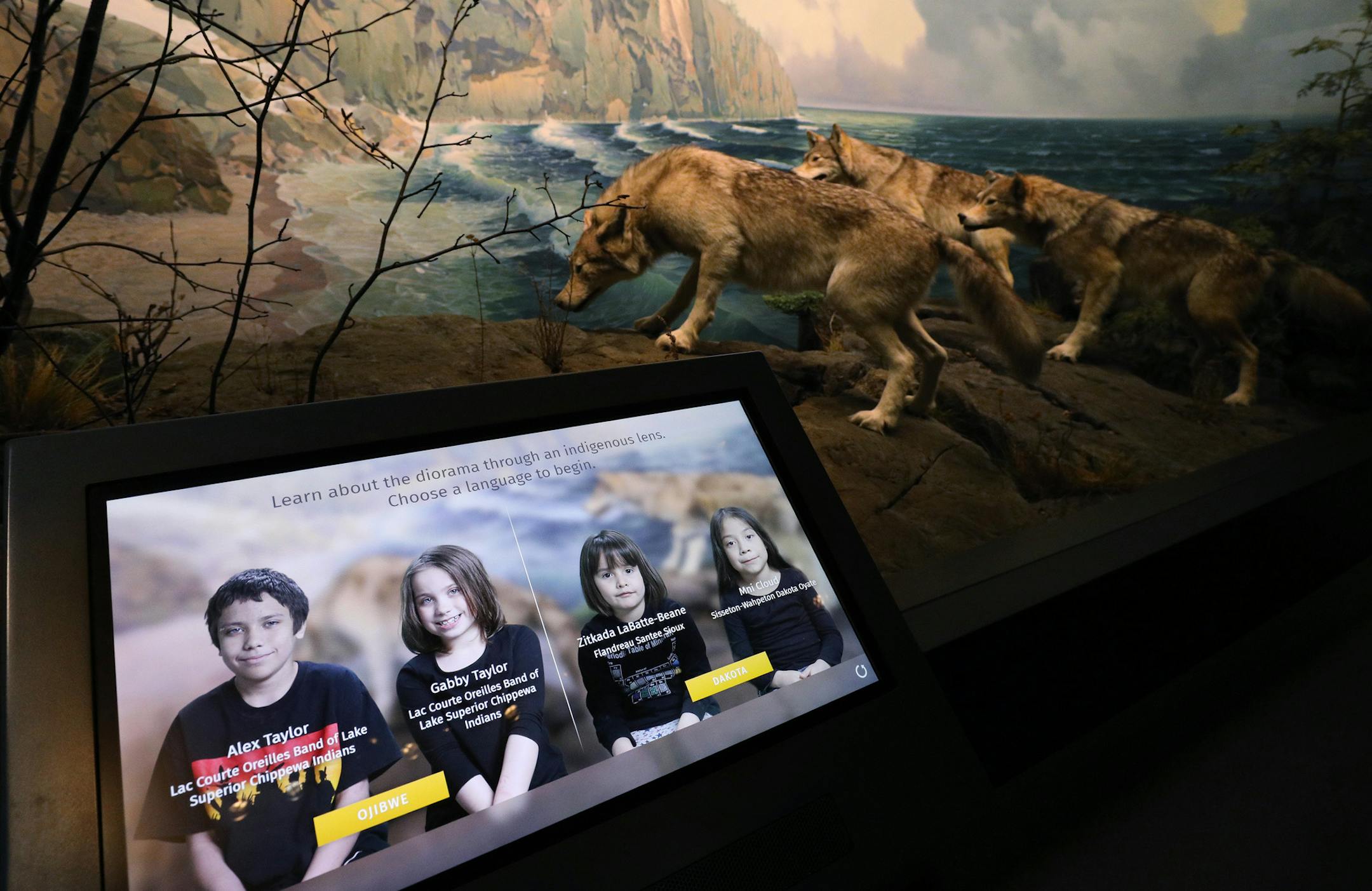 Originally created in the 1940s, a restored diorama of three wolves hunting on Shovel Point in Tettegouche State Park in Silver Bay and three other dioramas are brought to life through creative narrations by two Dakota kids and two Ojibwe kids from the Bdote Learning Center in Minneapolis, whose tribes are native to Minnesota (a name actually derived from the Dakota words "mni sota," meaning "land of sky-blue water").