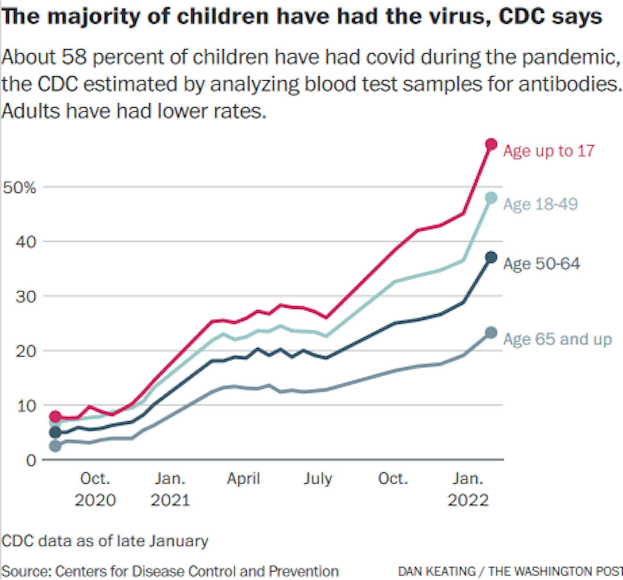 Infection rates are much higher for children and younger adults, the study found. It estimated that 58% of children up to age 11 have antibodies from natural infection, along with the same share of children age 12 to 17.