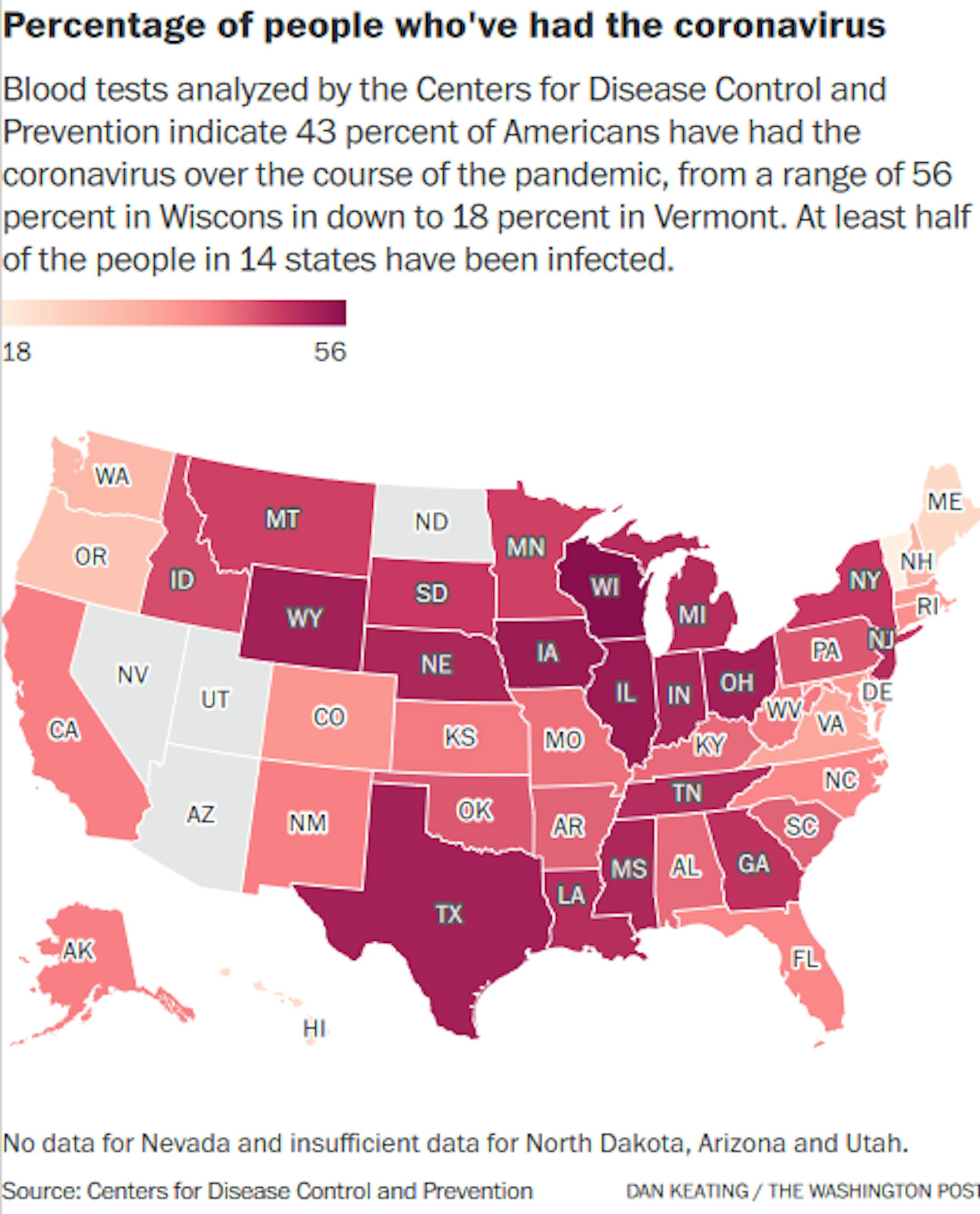 The data goes through late January, when the omicron variant of the coronavirus was causing more than 500,000 cases a day, meaning the number of Americans now infected is considerably higher. The data comes from 72,000 blood samples taken in January.
