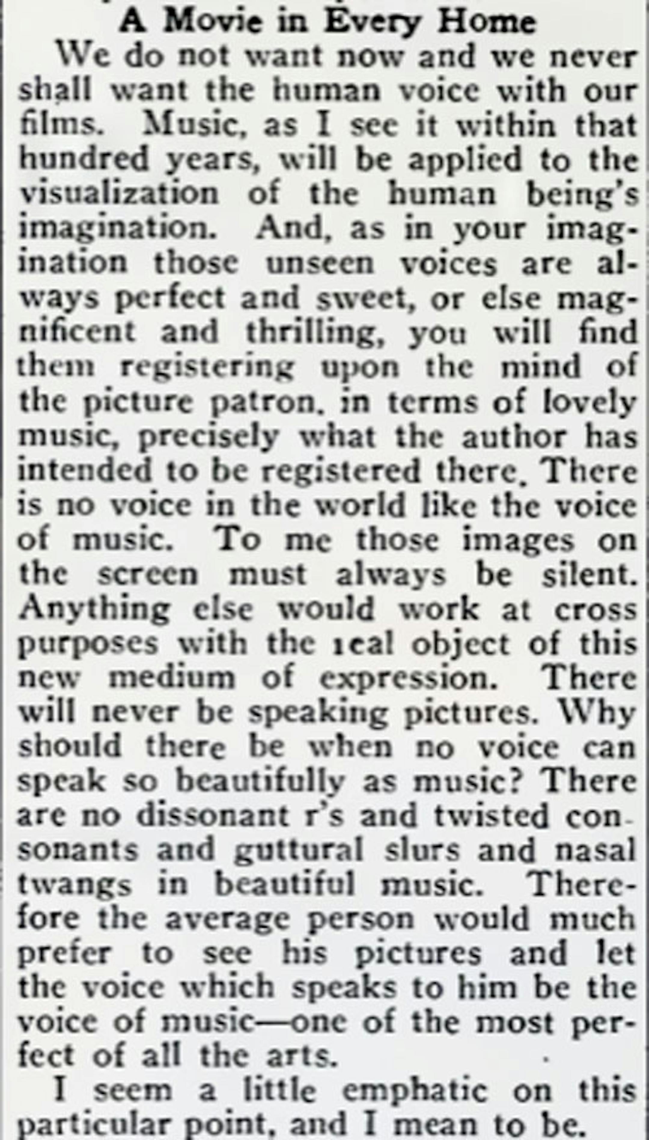 It's hard to believe that he thought synchronization would be impossible, and his reasons don't have anything to do with technical challenges. People wouldn't want it. The opposite would be true, of course. They'd clamor for it. They'd overturn the industry demanding it. He's right about the greatest composers of th day devoting thier skill to soundtracks, but they wouldn't be scoring for movies free of dialogue.