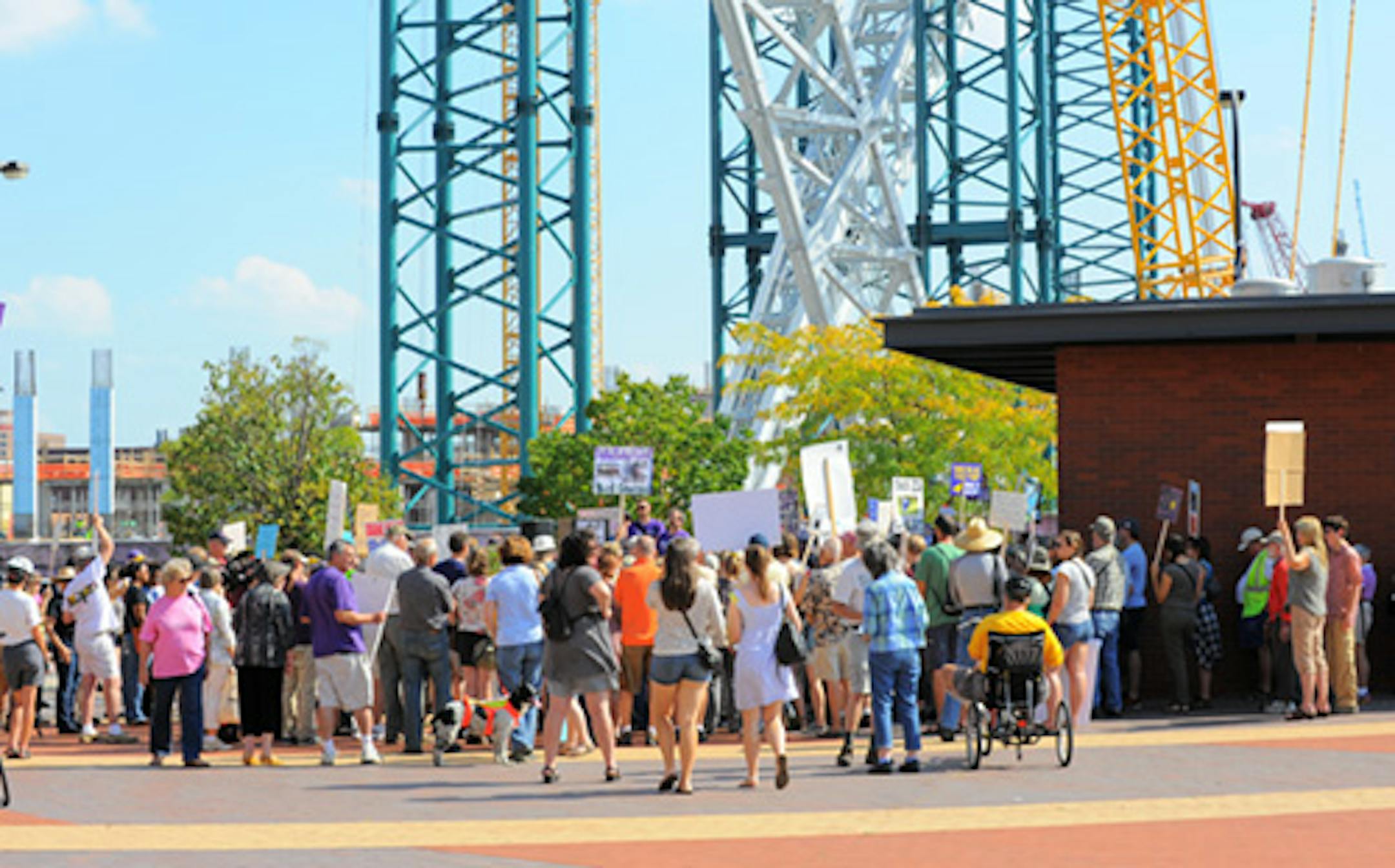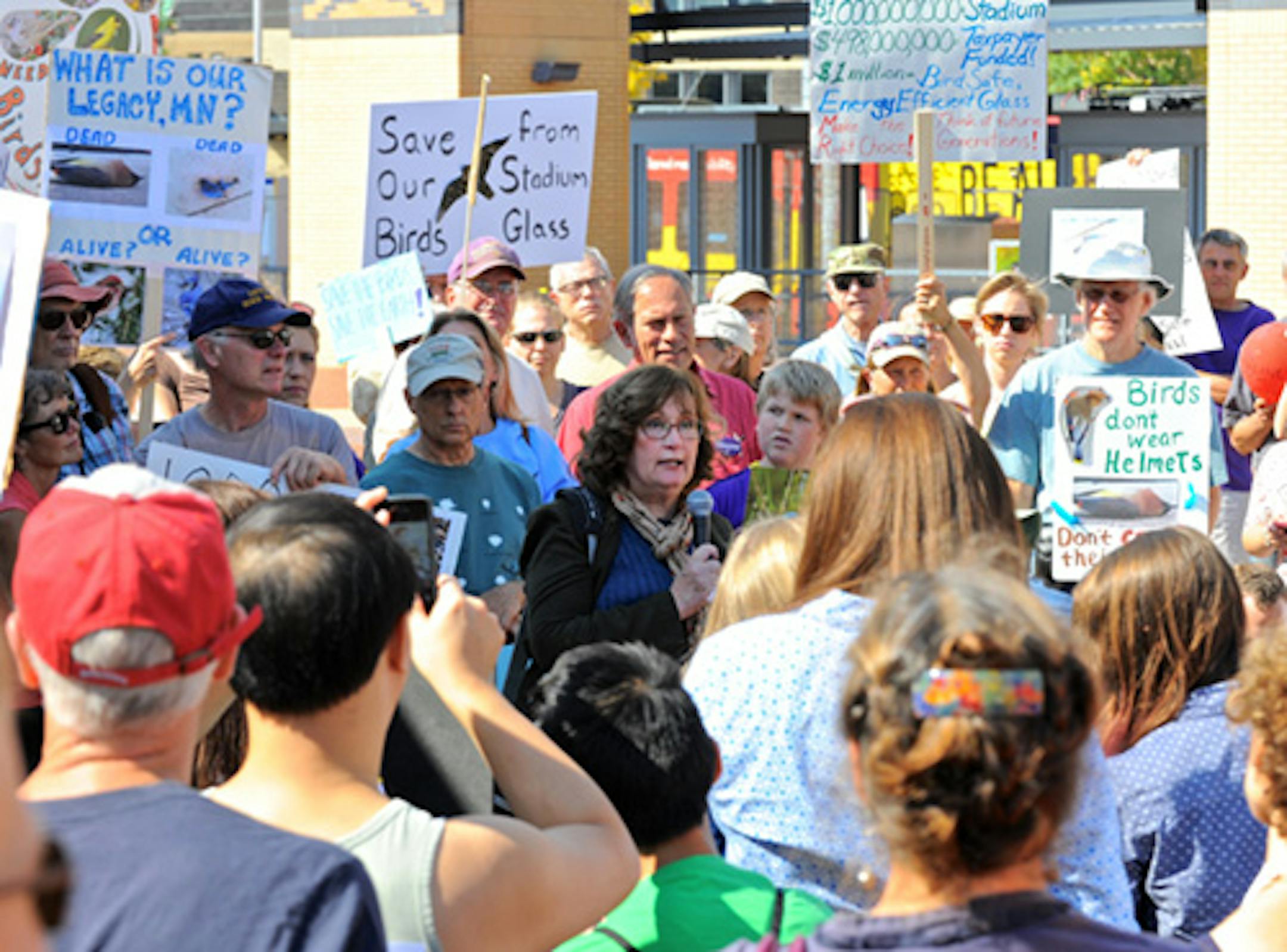 The refusal by the Minnesota Sports Facility Authority and the Minnesota Vikings to use bird-safe glass in the stadium now under construction drew an estimated 200 persons to a protest rally Saturday afternoon. Birders gathered across the street from the stadium site to hear speakers, and wave banners and signs. They want the stadium's huge signature "window" which will cover the end of the stadium facing downtown to be made of glass which does not reflect what is in front of it. Those reflections visually continue the natural world as birds see it, causing them to attempt to fly through. Most birds colliding with windows die. Below, author Laura Erickson from Duluth speaks to the crowd, which gathered in front of the construction site.