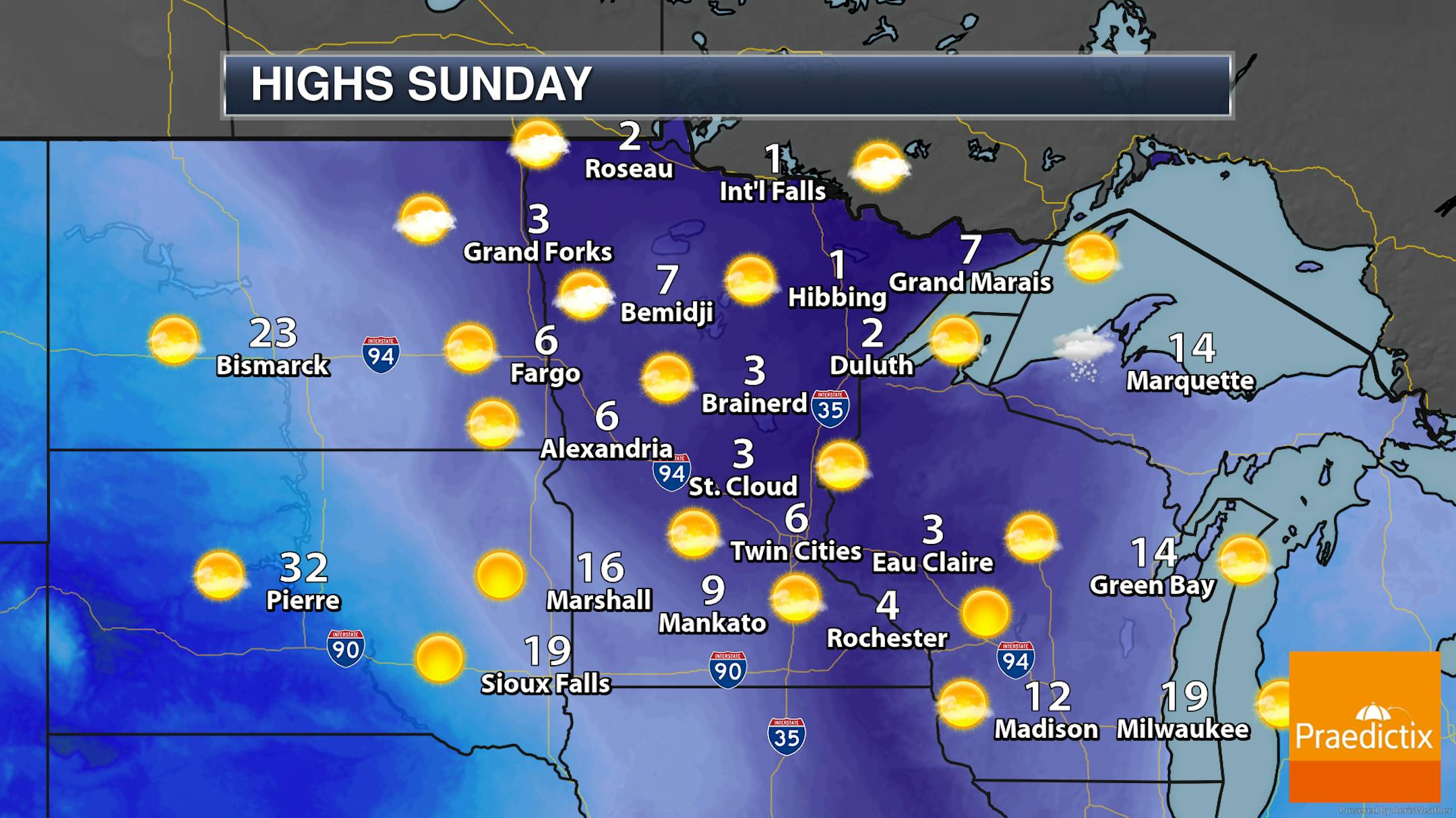 But not necessarily by much. Highs under mainly sunny skies will climb into the single digits across much of the state, with the warmest weather found in southwestern Minnesota as they climb into the teens.