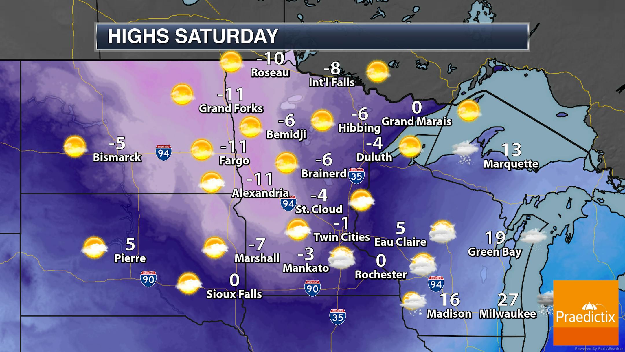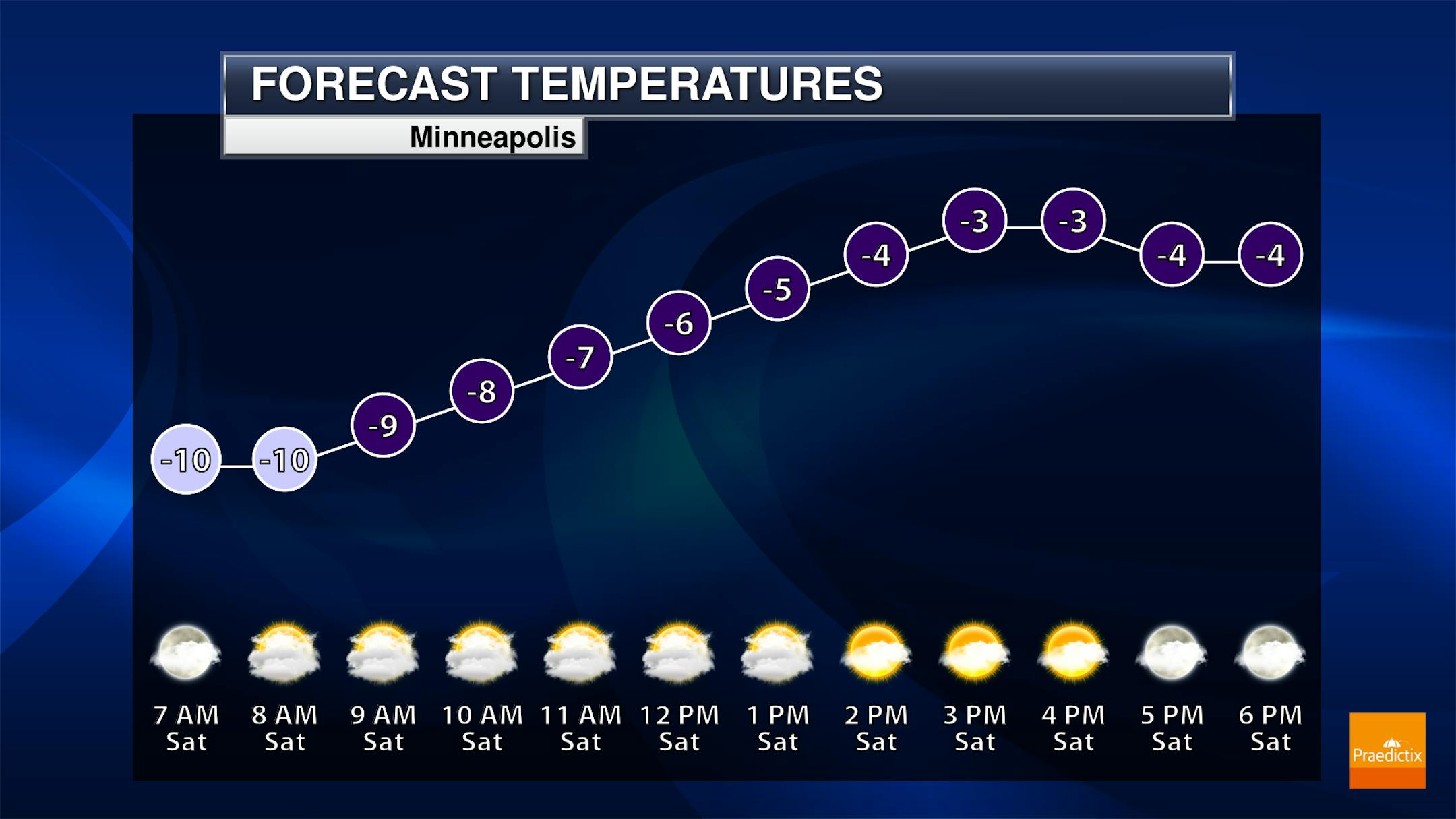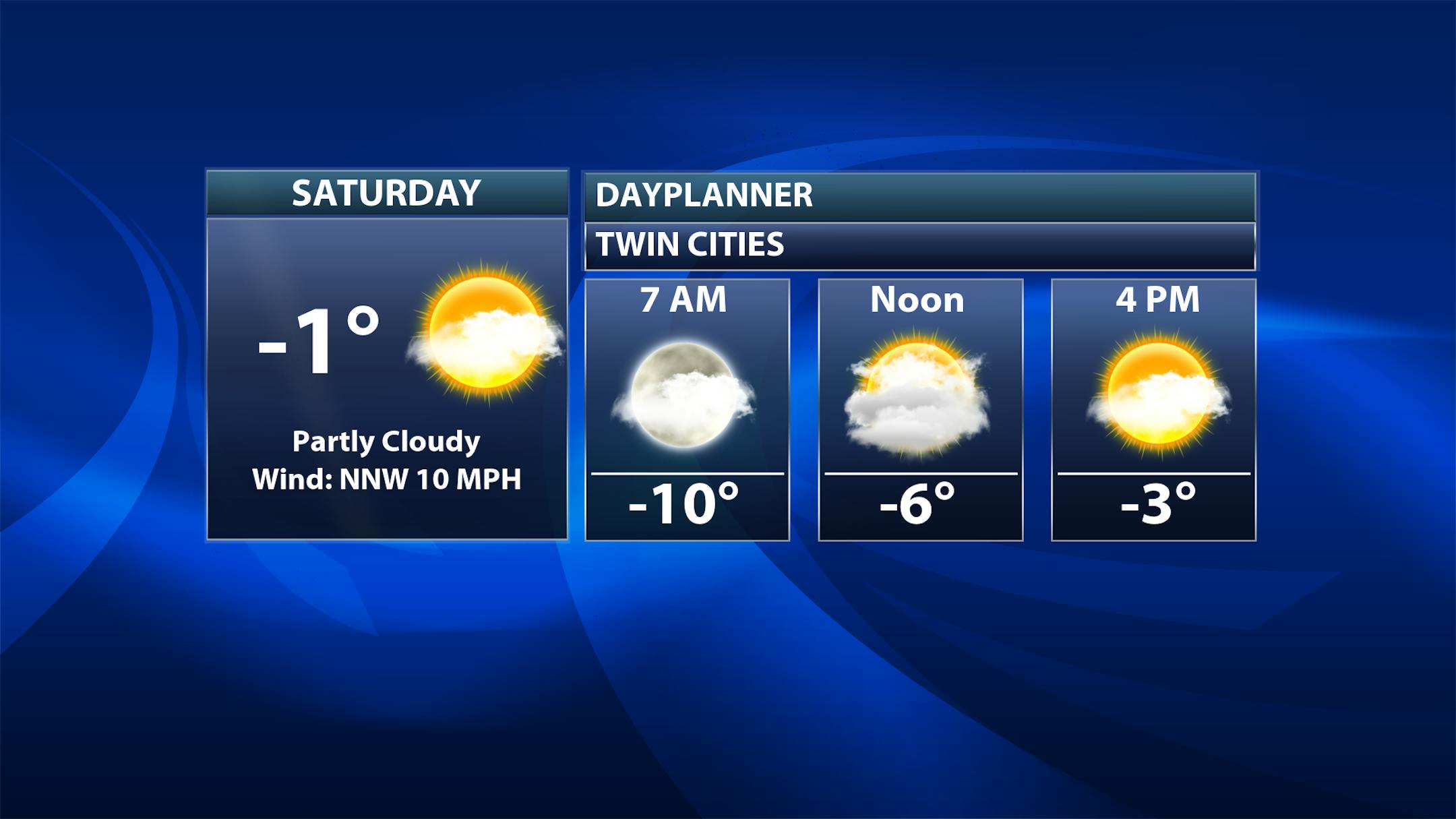 A closer look at the Twin Cities on Saturday shows a mix of sun and clouds in the forecast with those temperatures staying below zero throughout the day.