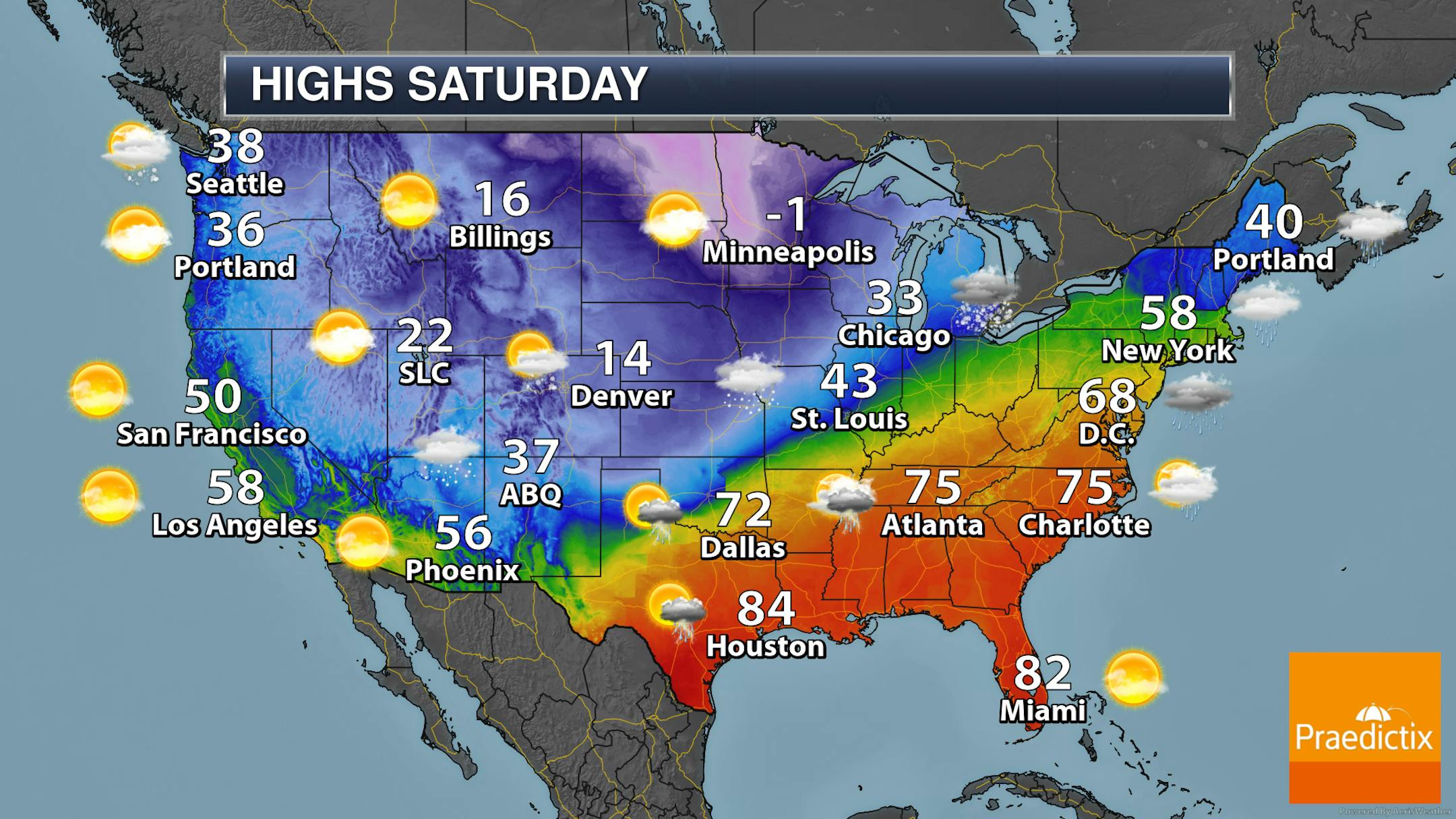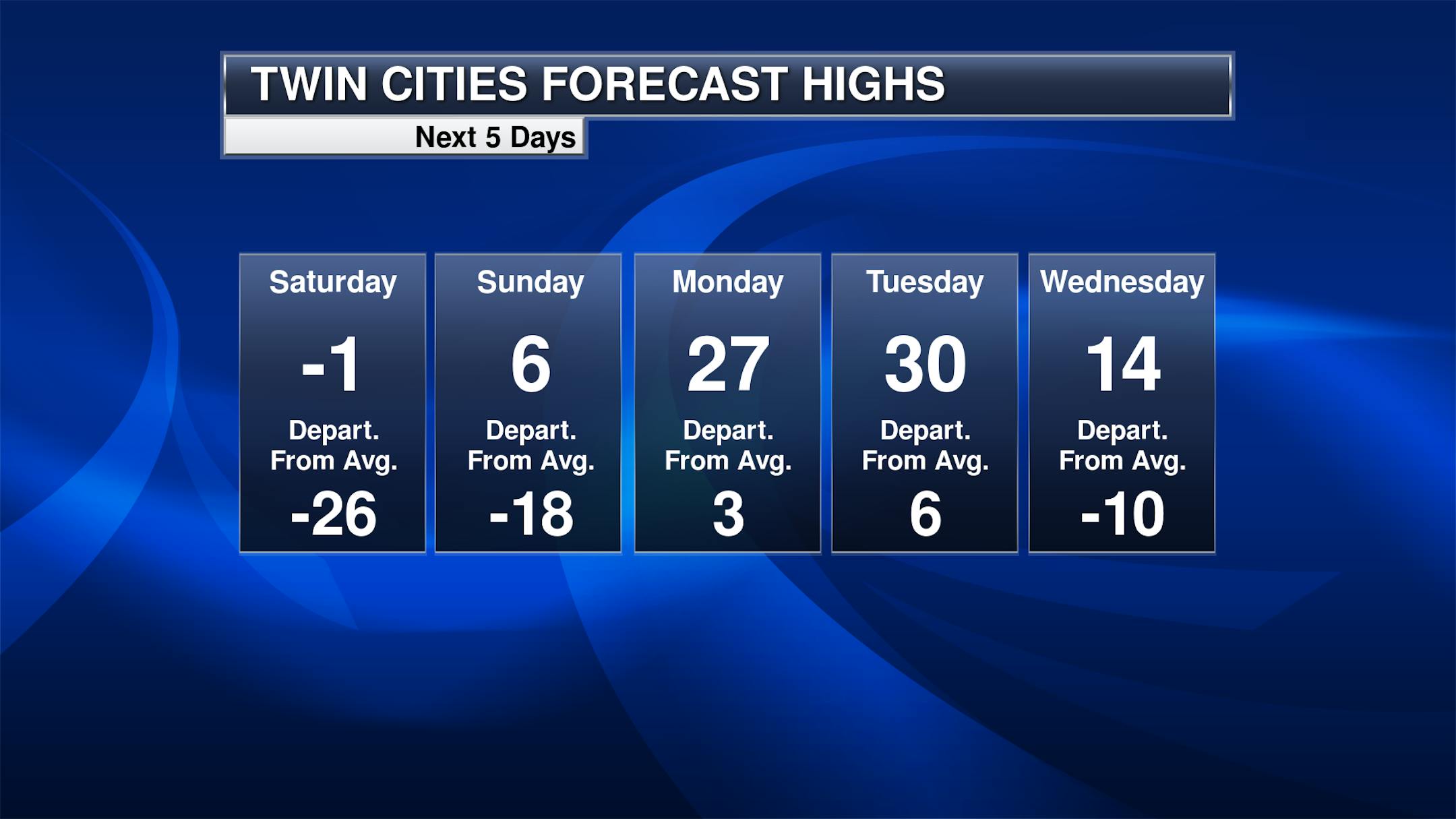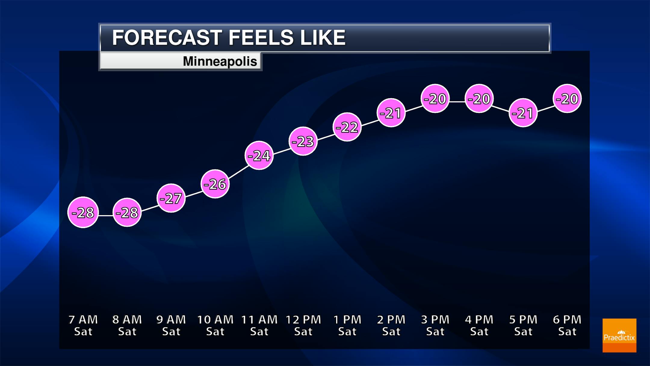 A closer look at the Twin Cities on Saturday shows a mix of sun and clouds in the forecast with those temperatures staying below zero throughout the day.