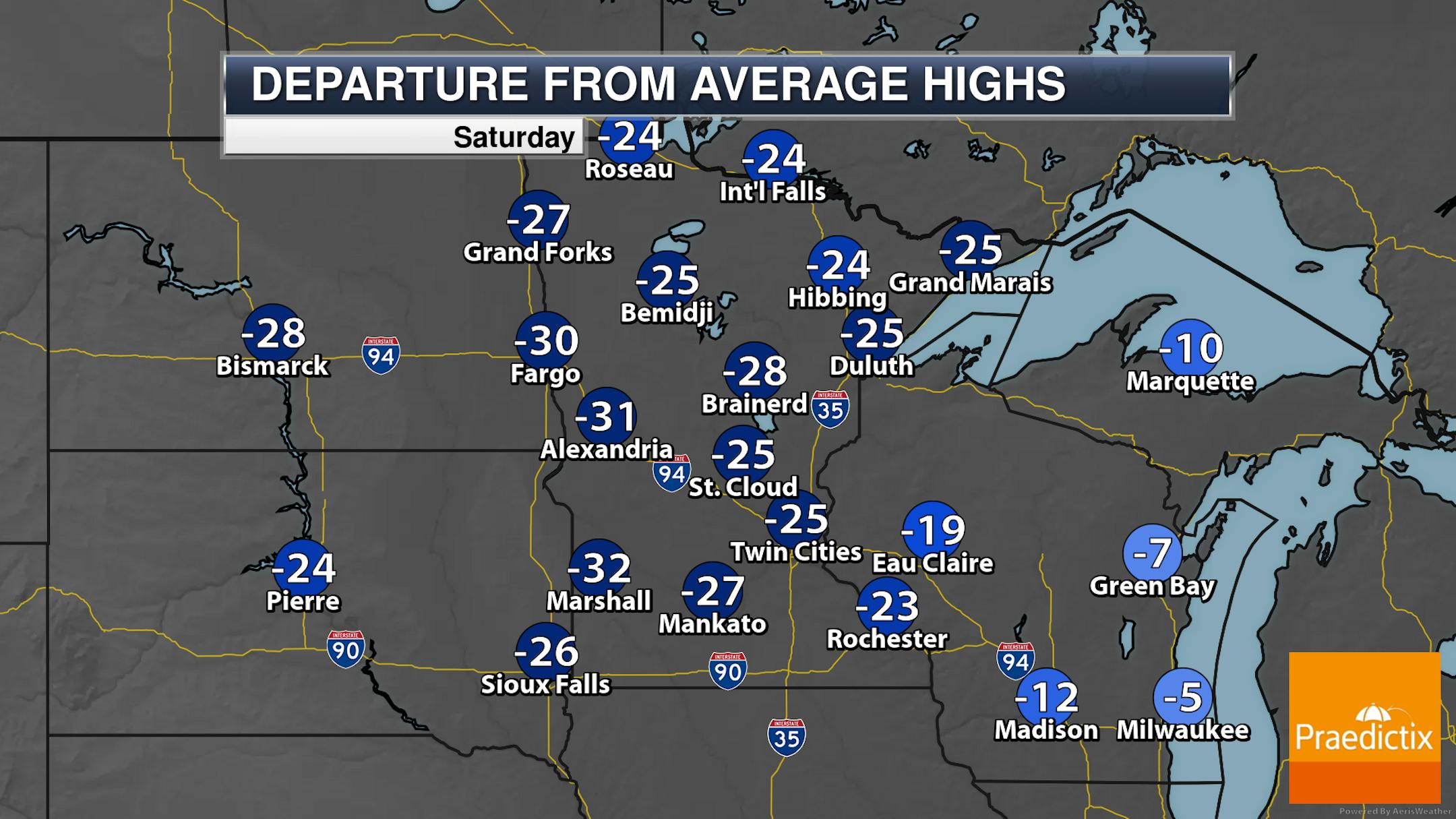 As we look across the state, northeastern and southeastern Minnesota will be the warmest locations on Saturday as highs climb into... the single digits above zero (barely). Most locations will stay below zero through the entire day, and across western Minnesota, highs could be over 30F degrees below average in the teens below zero.