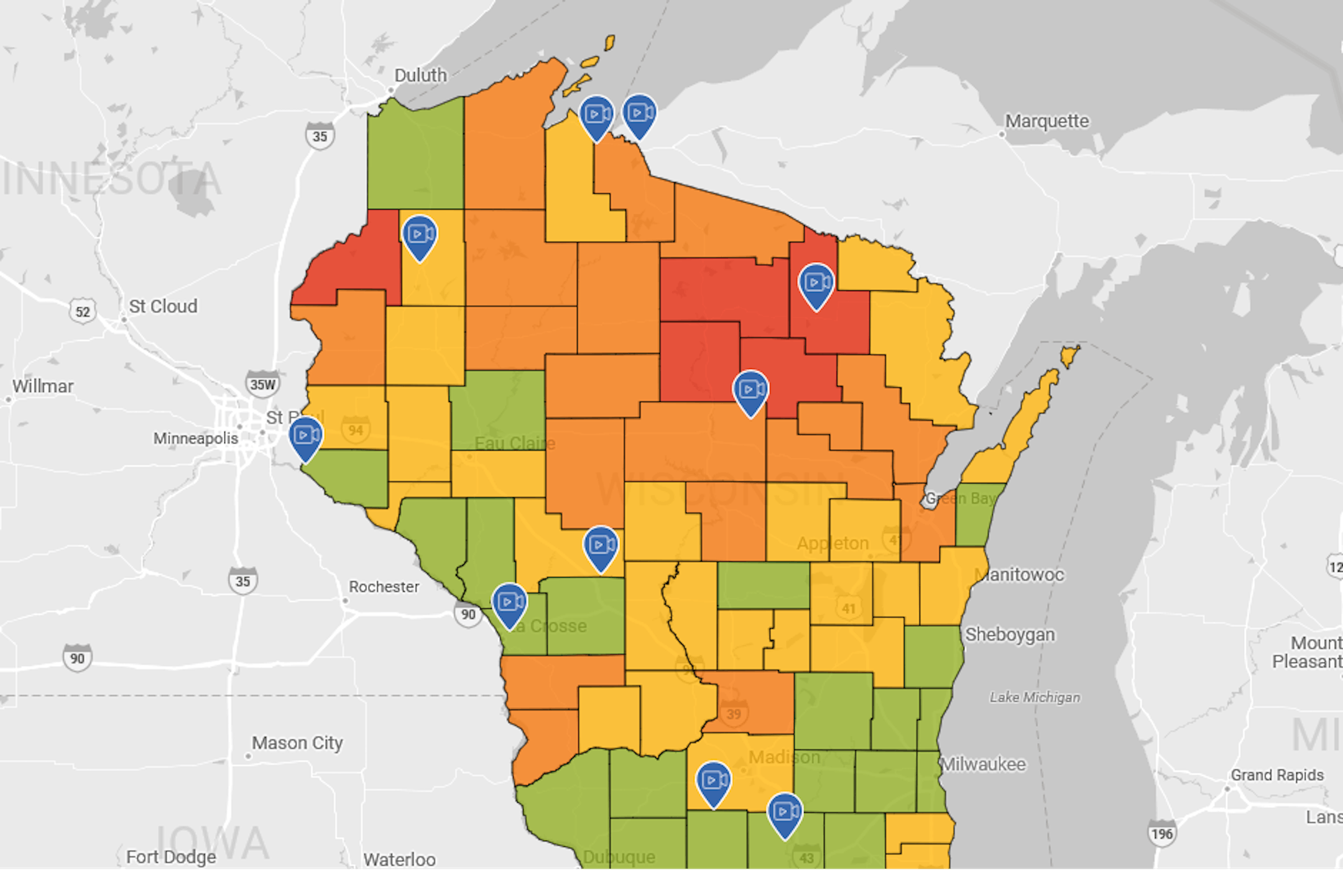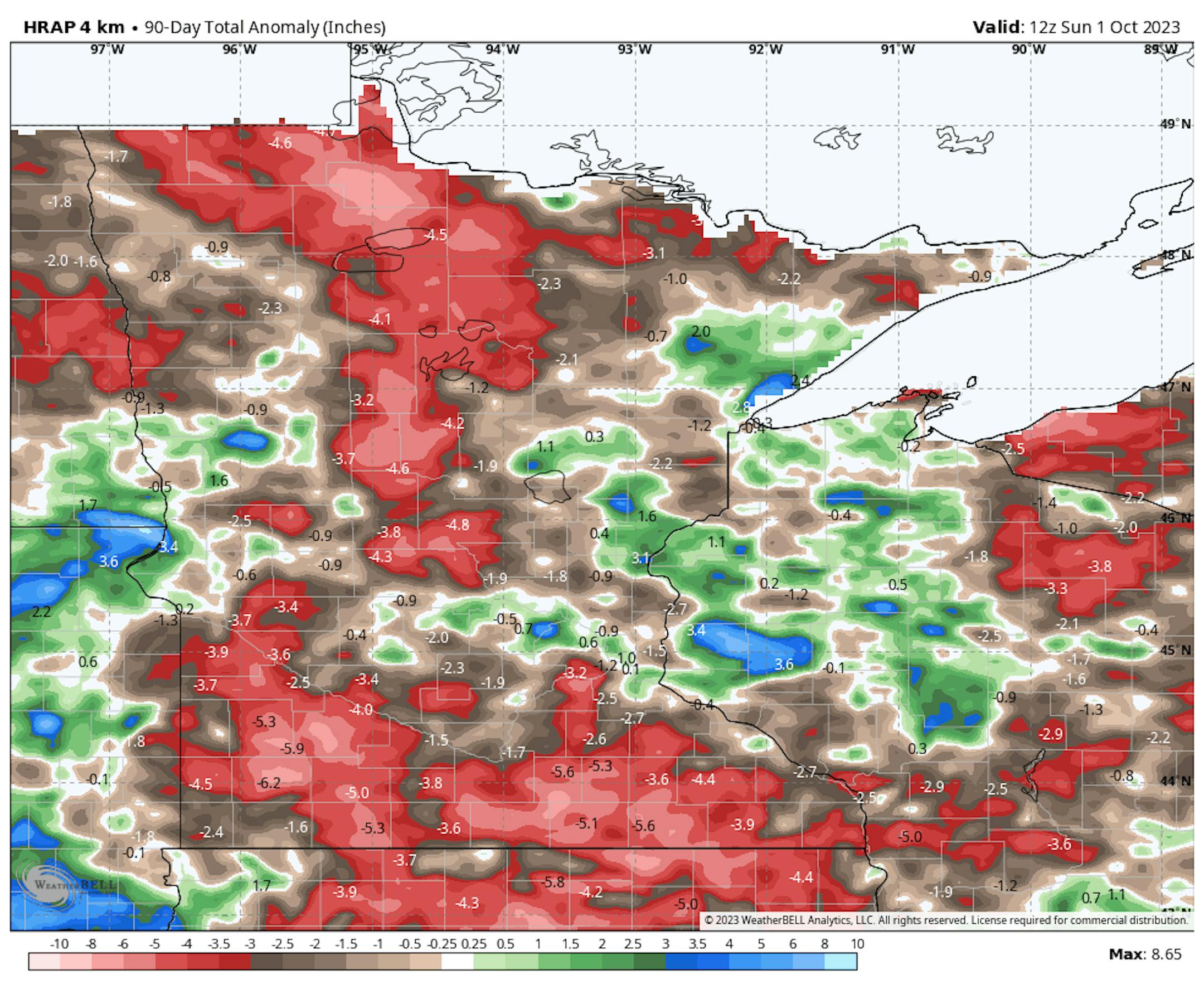Thanks to some recent heavy rains parts of the state are now in a surplus over the last 90 days. Some of the biggest surpluses (which aren't many) are showing up in blue in pockets along and north of the Twin Cities and also just east of the metro in western Wisconsin.