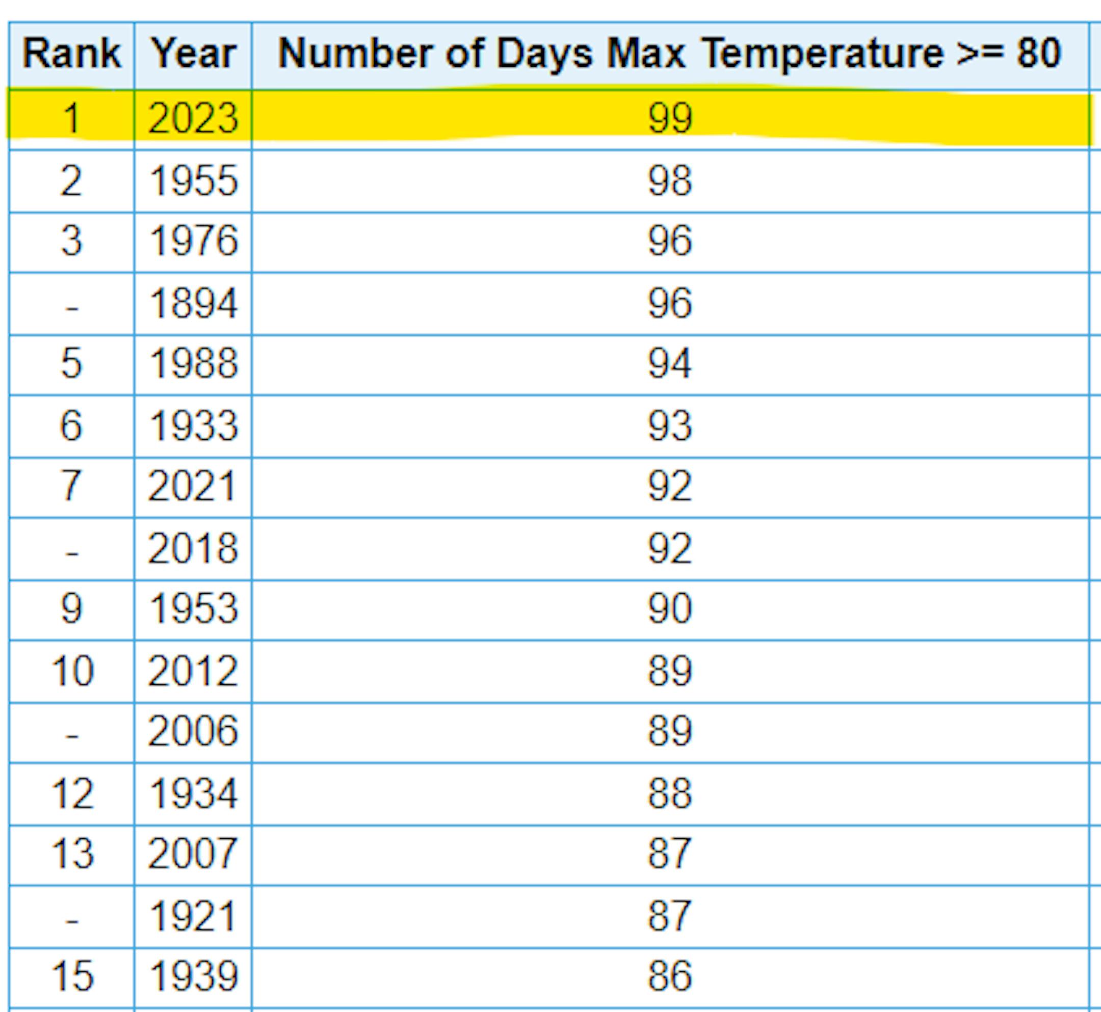 MSP has now had (33) 90F days so far this year, which is tied for the 5th most number of 90F days on record. We missed another 90F day by 1F degree on Monday.