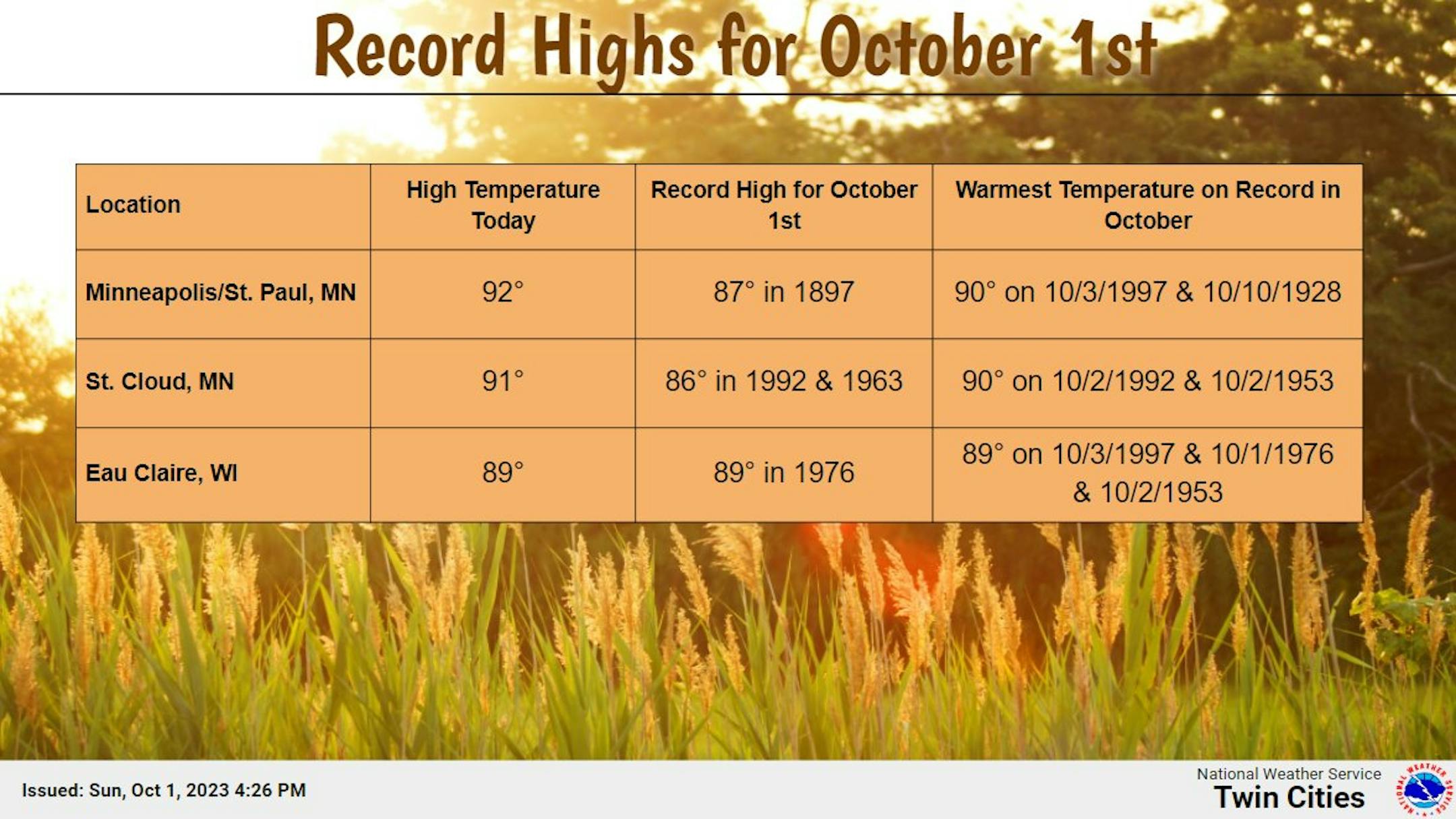 Hard to believe, but Sunday, October 1st was the hottest October day on record for both Minneapolis and St. Cloud!!
