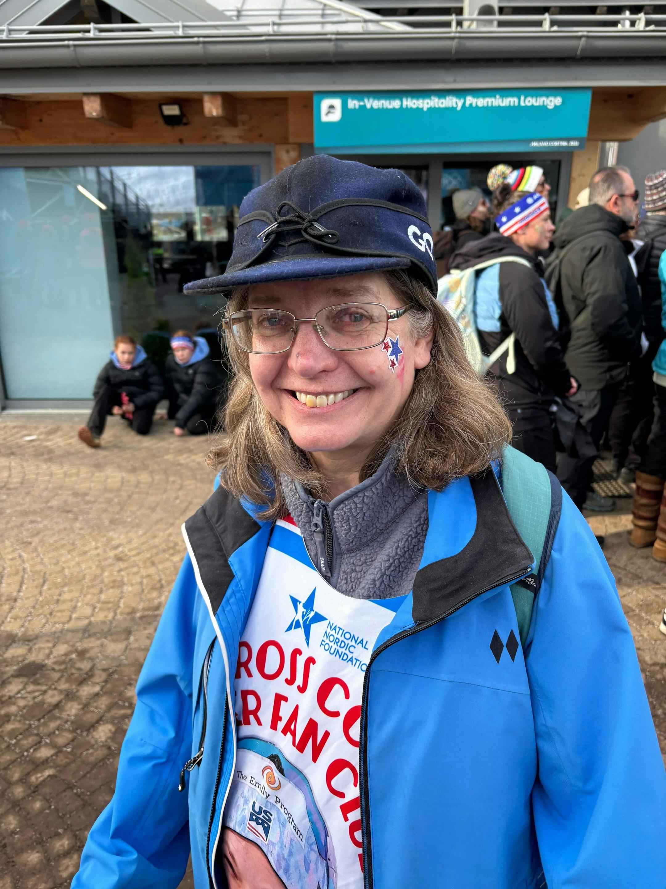 Linder wore an American flag as a cape, and had glitter on her cheeks, and looked like some of the other American fans I had seen. Except she was from Switzerland. She carried a packet of glitter to the race course and dabbed up people’s cheeks, including, she said, four elderly Norwegian women.