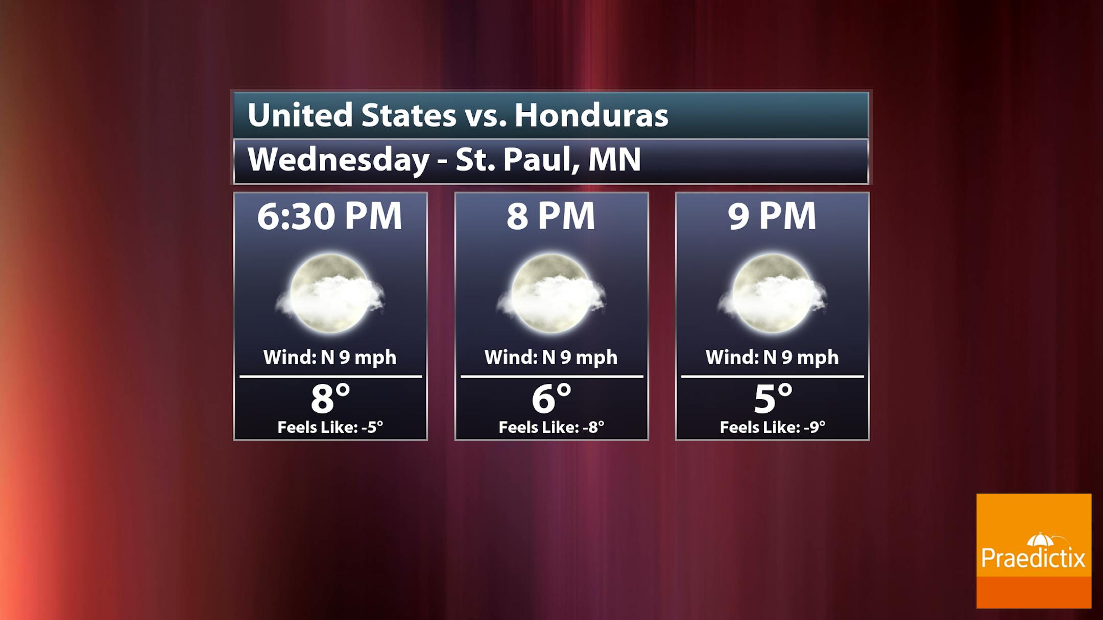 If you are going to brave the weather to watch the U.S. Men's Soccer Team Wednesday Night, make sure you bundle up! It won't be as cold as the Winter Classic was at the beginning of January, but game time temperatures will be in the single digits with wind chills below zero. The start of the match is at 6:30 PM at Allianz Field.