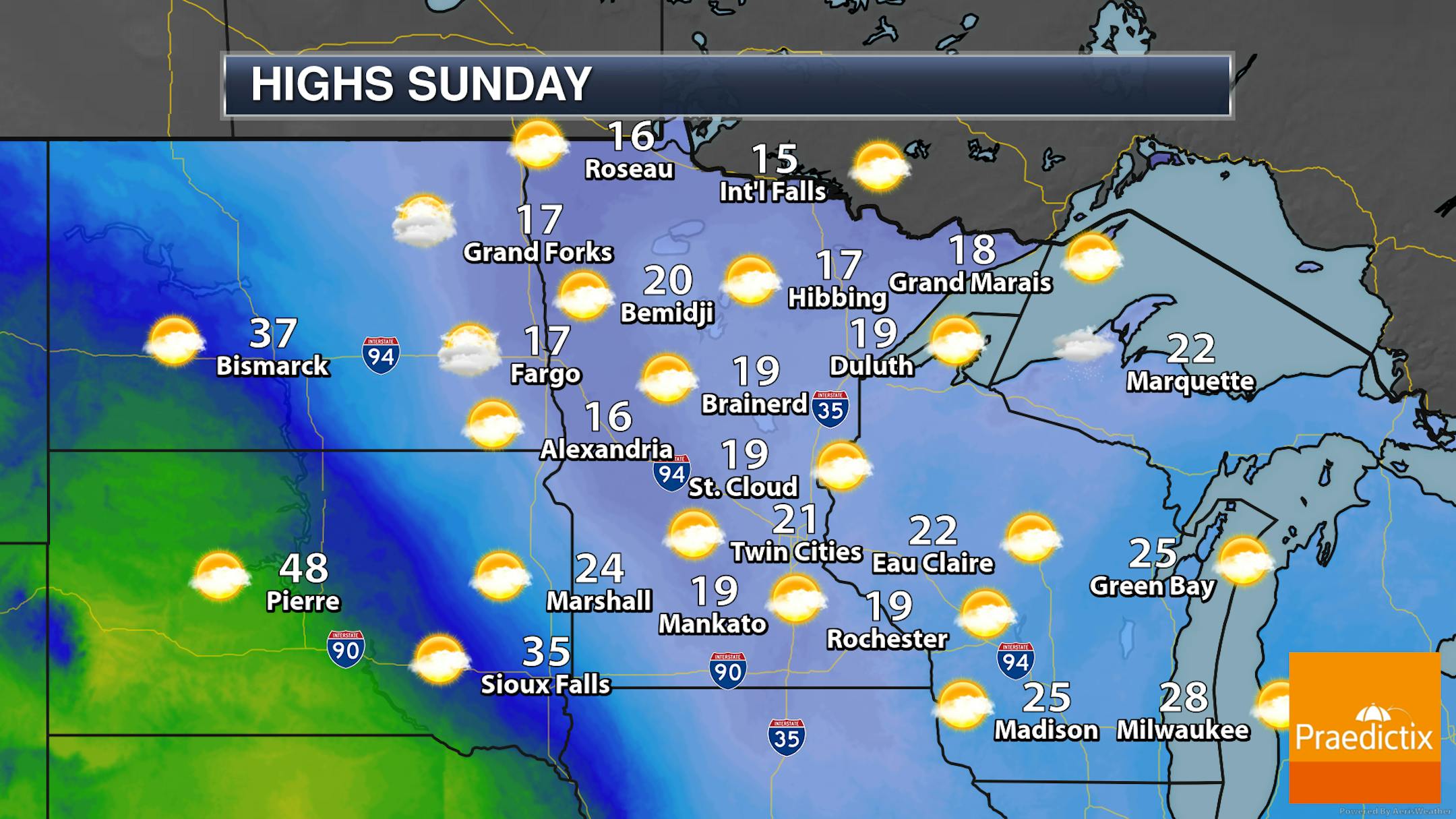 After highs were cooler once again Friday, we will see them warm into the 20s this weekend here in the Twin Cities. Saturday will be the warmer day with highs approaching 30F, but behind a cold front, we'll be back into the low 20s for highs on Sunday. Expect a mix of sun and clouds to partly sunny skies each day.