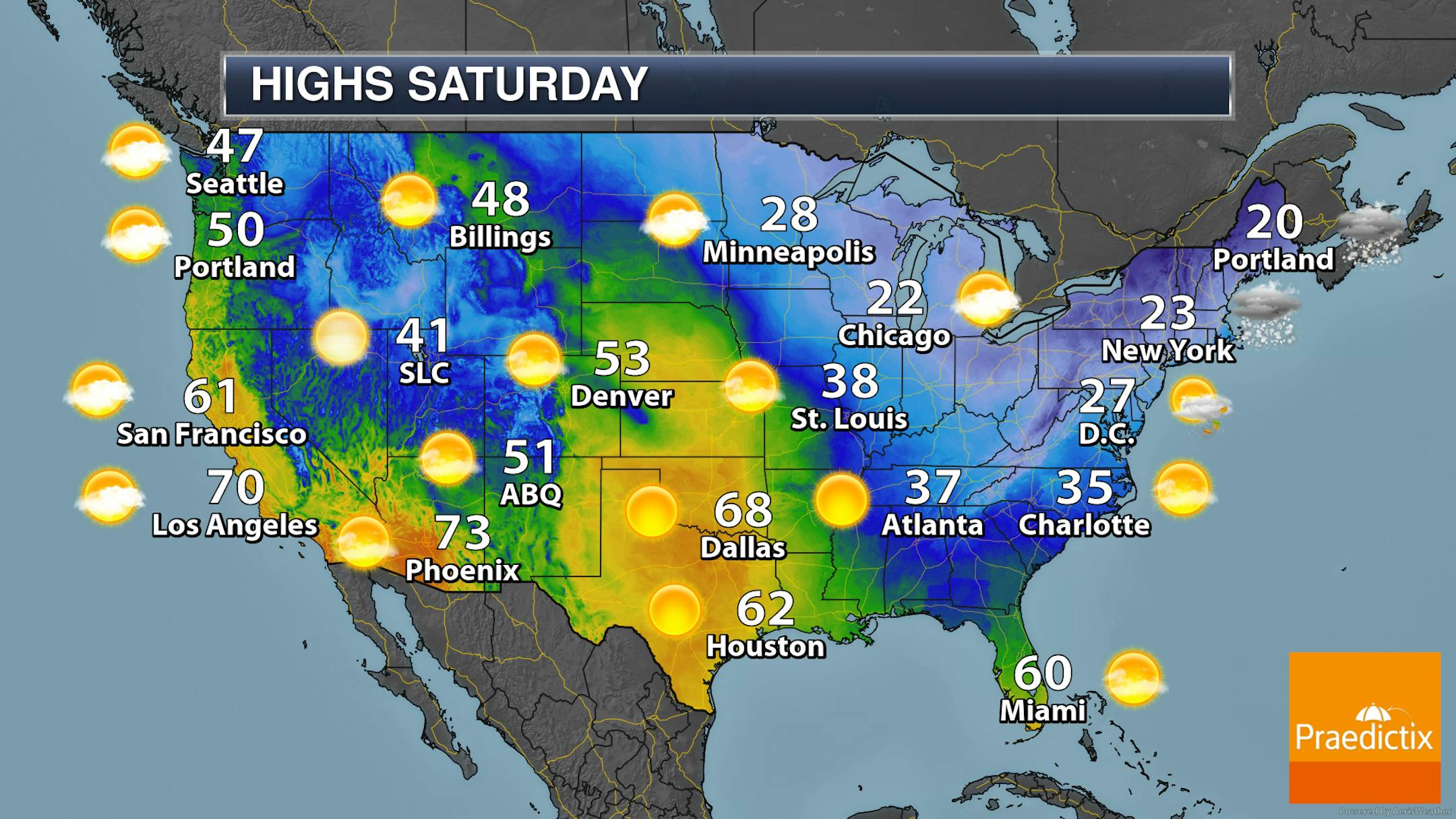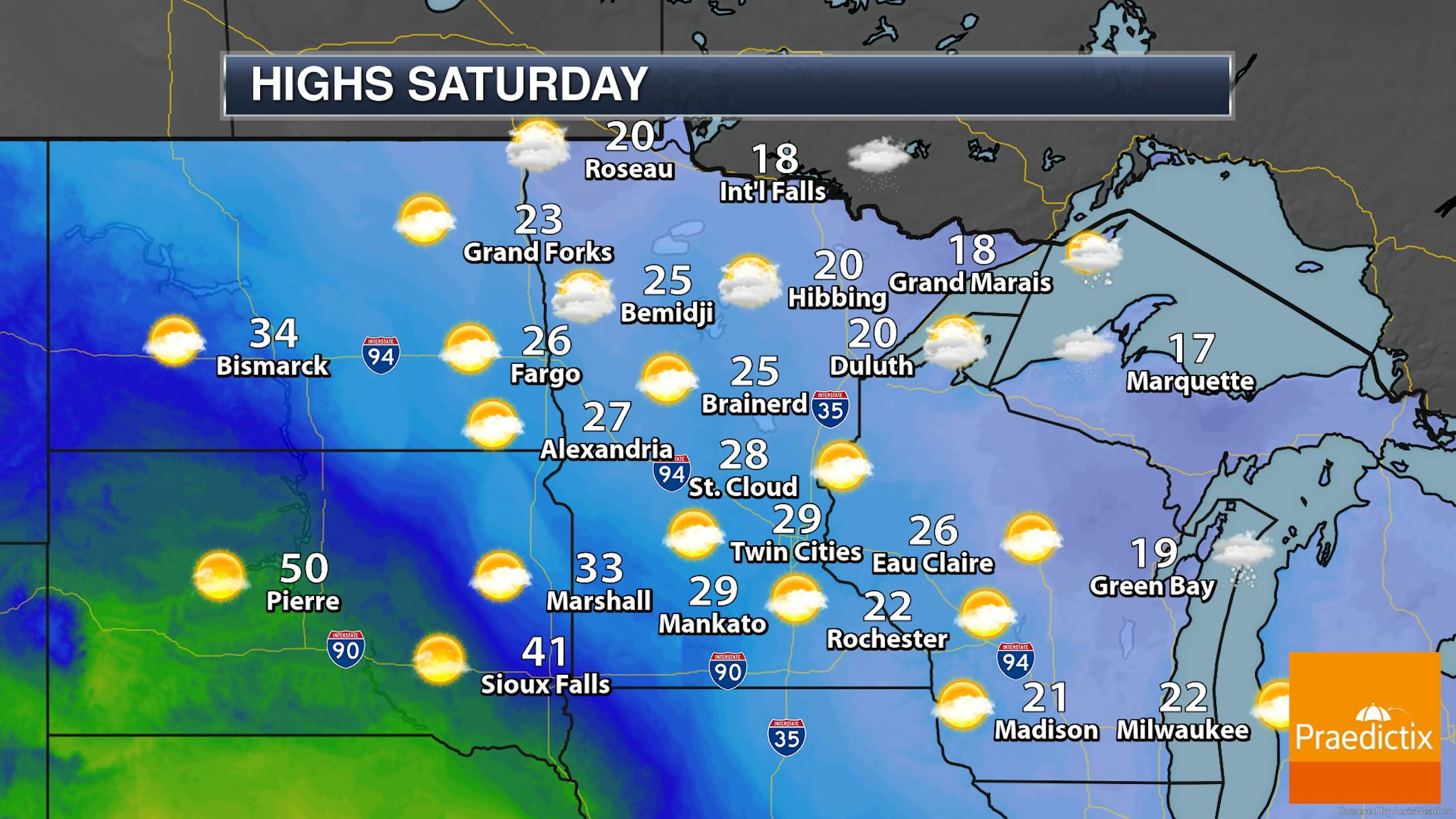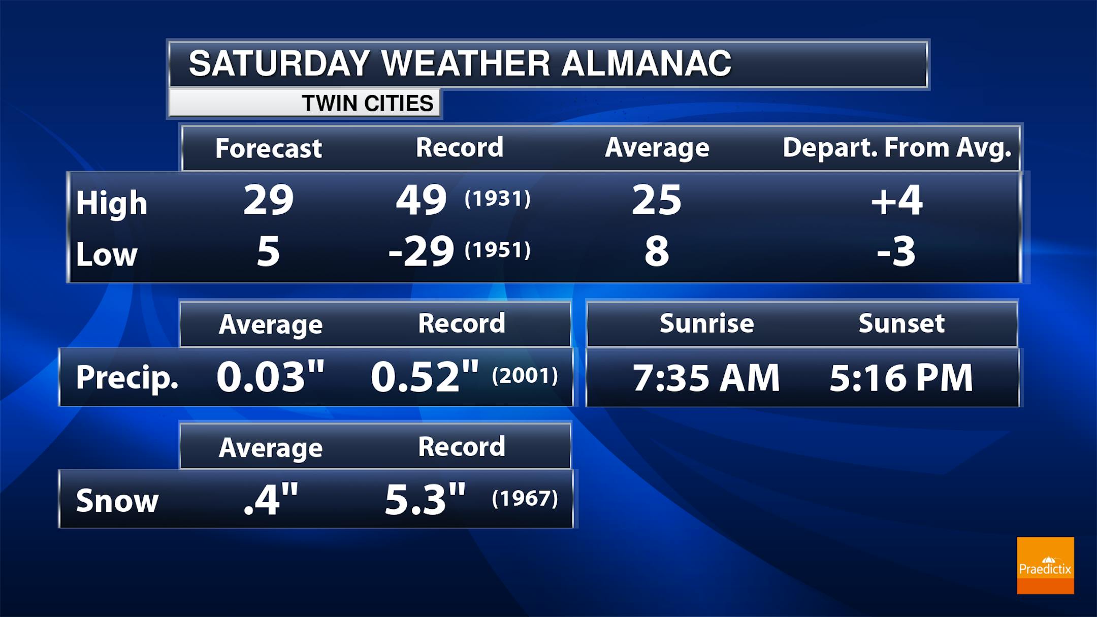 Here's a closer look at Saturday in the Twin Cities. We'll start off around 10F in the early morning hours before climbing to the 20s by the midday and nearing 30F during the afternoon.