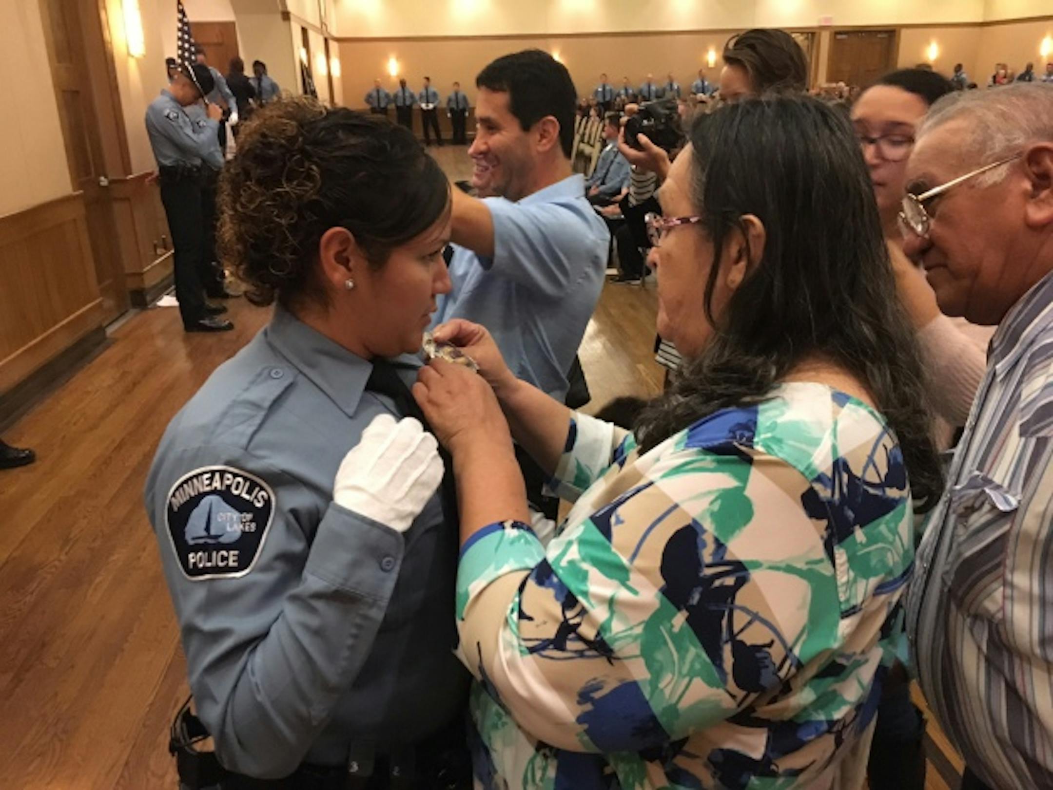 A family member pins a badge on a newly sworn-in Minneapolis police officer during a graduation ceremony on Tuesday, November 1, 2016. Libor Jany/Star Tribune