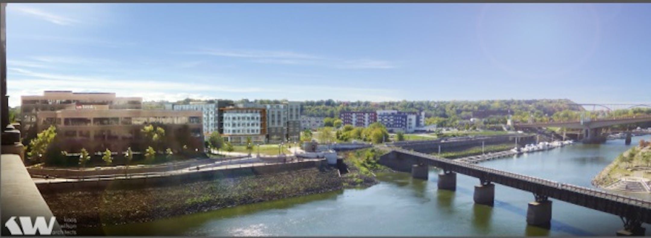 A view of the project, towards the right of the rendering, from downtown St. Paul. Rendering courtesy of Bloomington-based Kaas Wilson Architects.