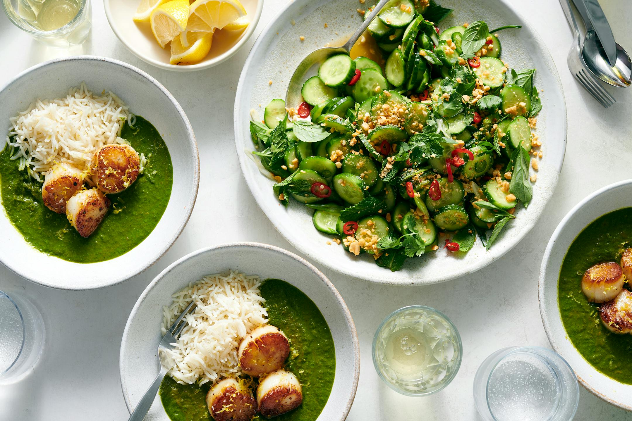 A simple-to-make curried spinach leans in an Indian direction, fully flavored with ginger, garlic and aromatics, but restrained. The quickly cooked spinach is blitzed into a luscious purée that functions as a savory green resting place for the plump scallops. Steamed rice is a natural choice to serve alongside.