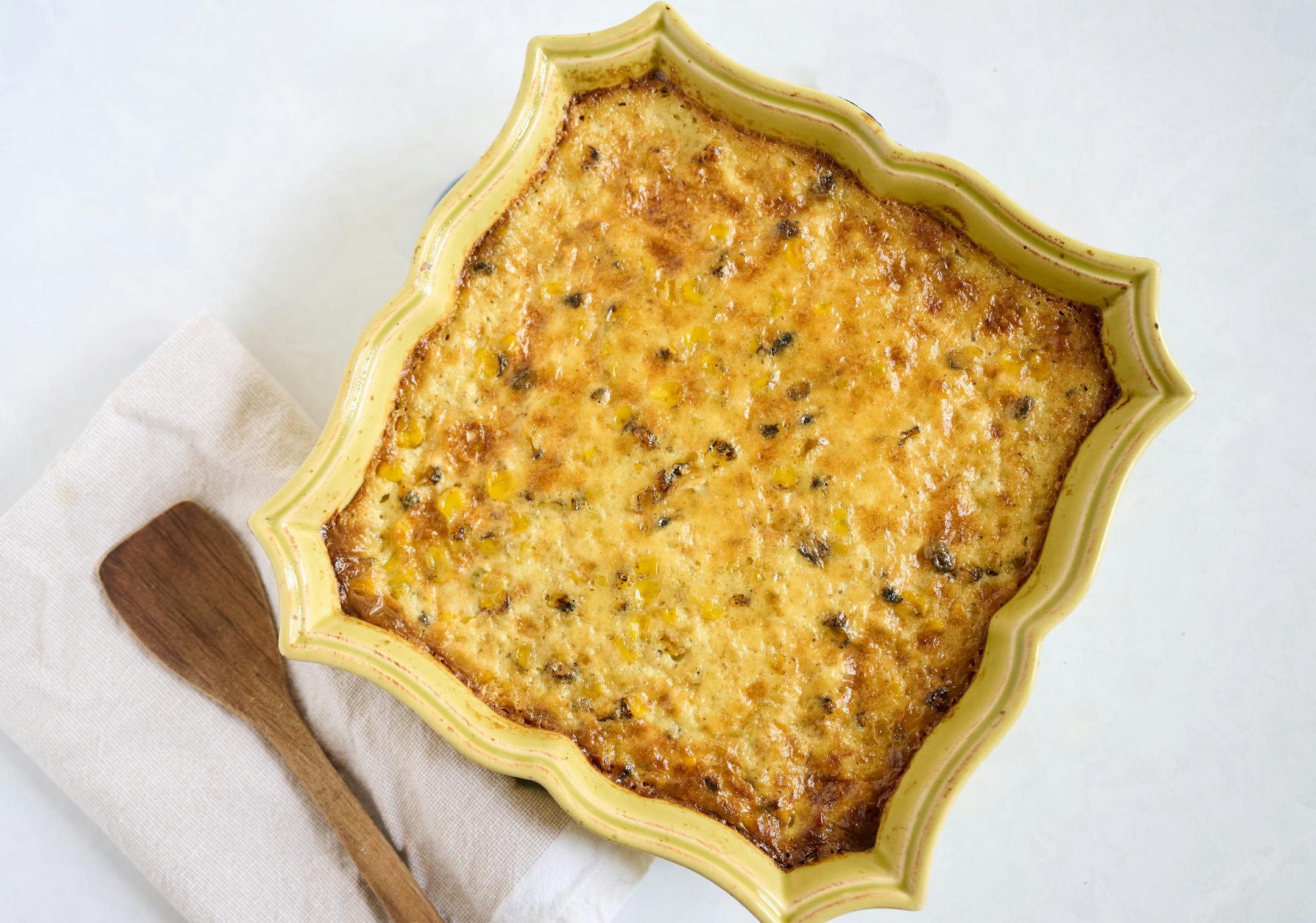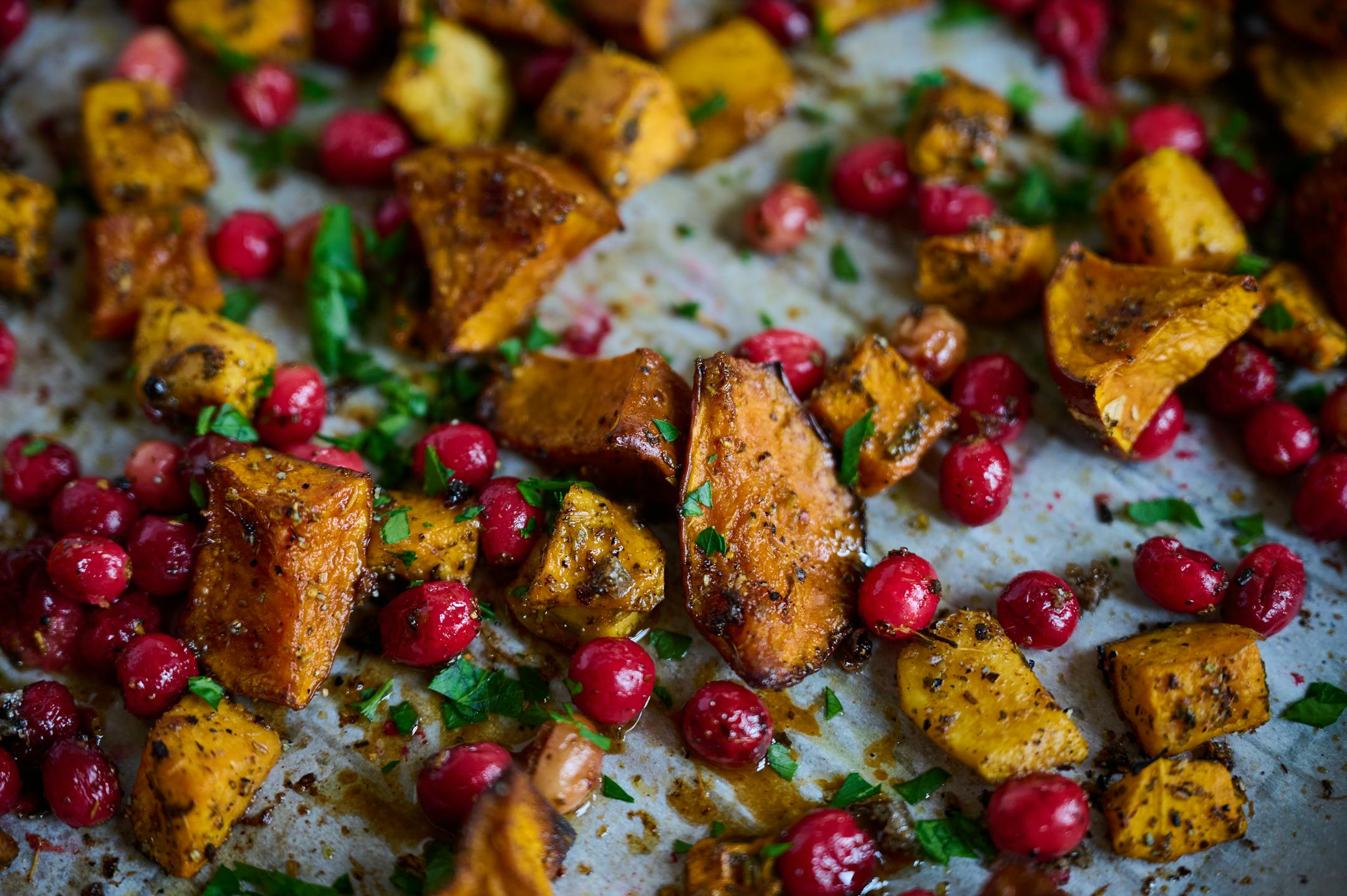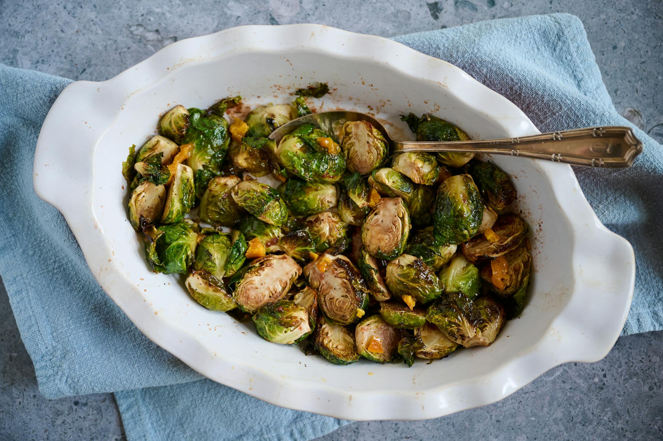 I’ve chosen caramelized Brussels sprouts for their sweet-tangy orange-ginger glaze, but cauliflower, broccoli or cabbage will work, too. The old-fashioned corn pudding, rich, creamy and chocked with roasted corn, is almost a meal in itself. Roasted sweet potatoes get a tangy-sweet bang from hot honey and bright cranberries.