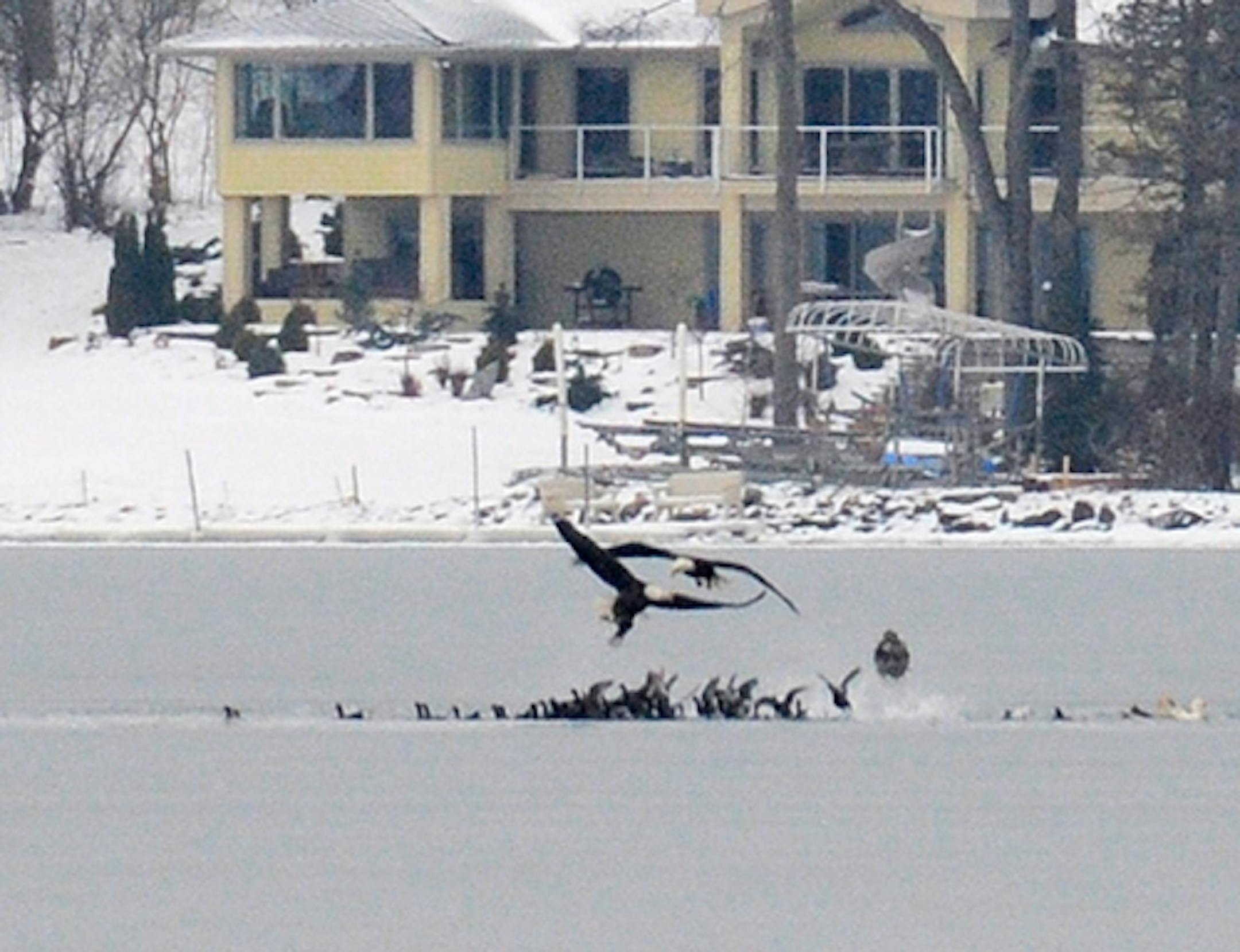 The eagles were seen Thursday from an eastern shoreline road in Minnetonka Beach. The first possible turn to the left from westbound County Road 15, just beyond the Arcola bridge, takes you to a vantage point. The birds, however, are at least a quarter mile offshore.