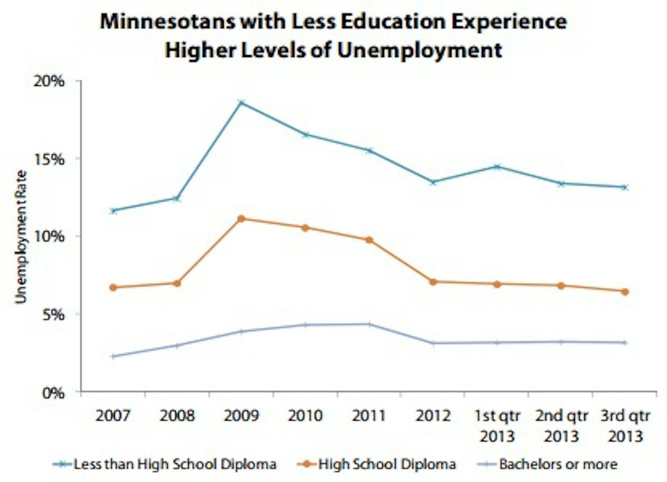 Minnesotans without a high school diploma have an unemployment rate of 13.2 percent. Those with a high school education have an unemployment rate of 6.5 percent. Those with a college diploma, by contrast, have an unemployment rate of 3.2 percent.