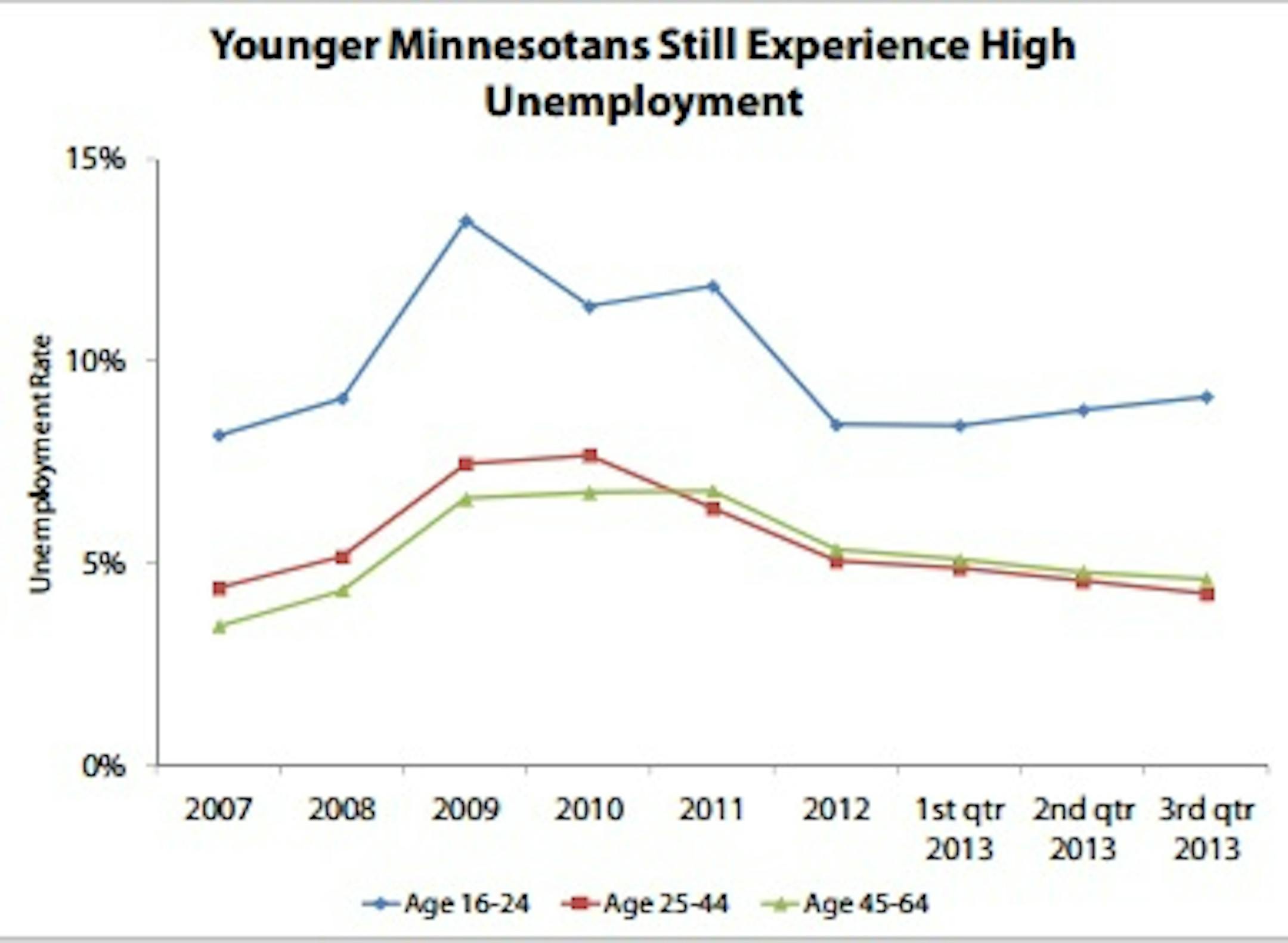 Young Minnesotans have seen their jobless rates improve, but 16- to 24-year-olds are still unemployed at a rate of 9.1 percent. This also is in contrast to older workers.