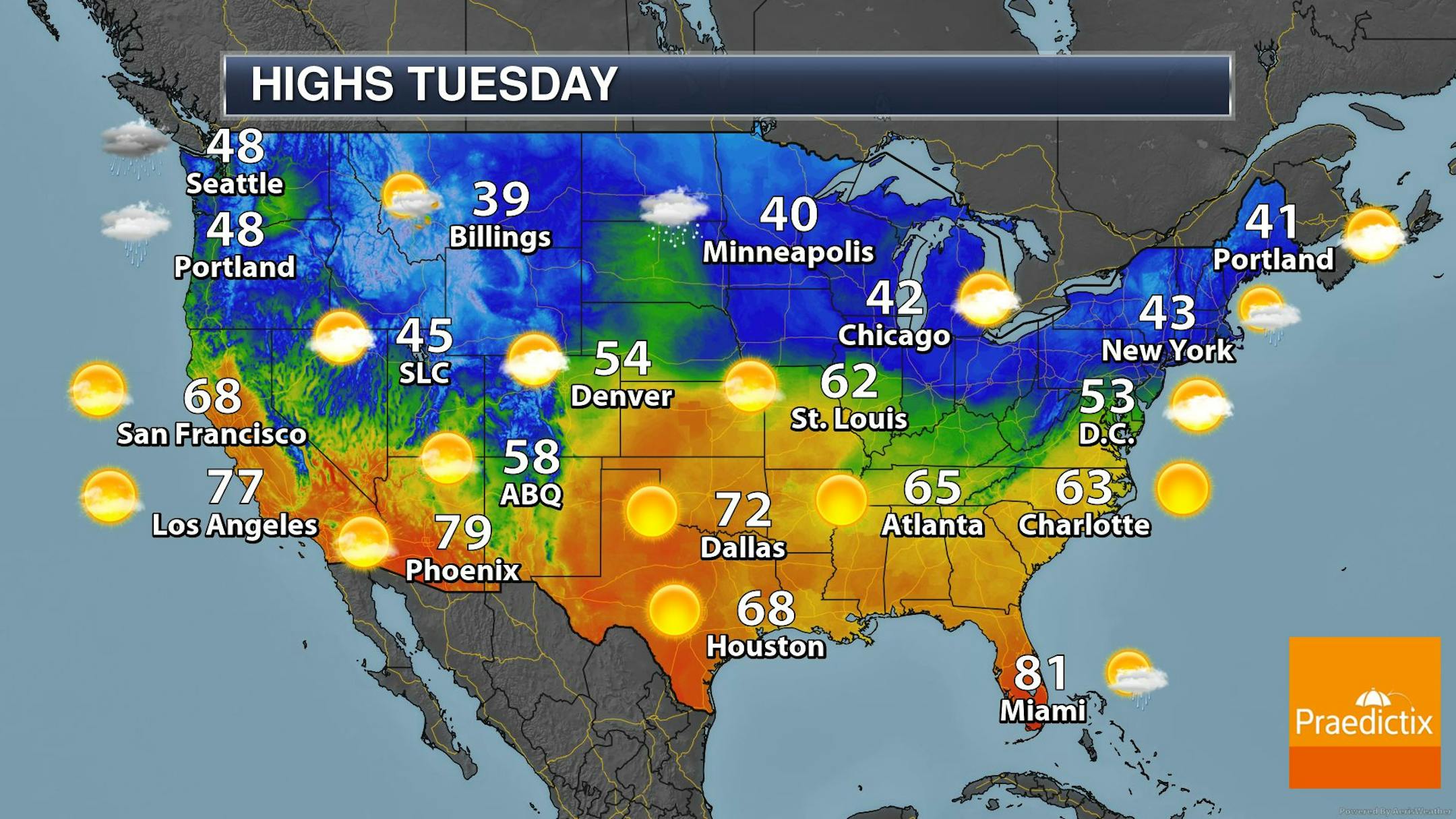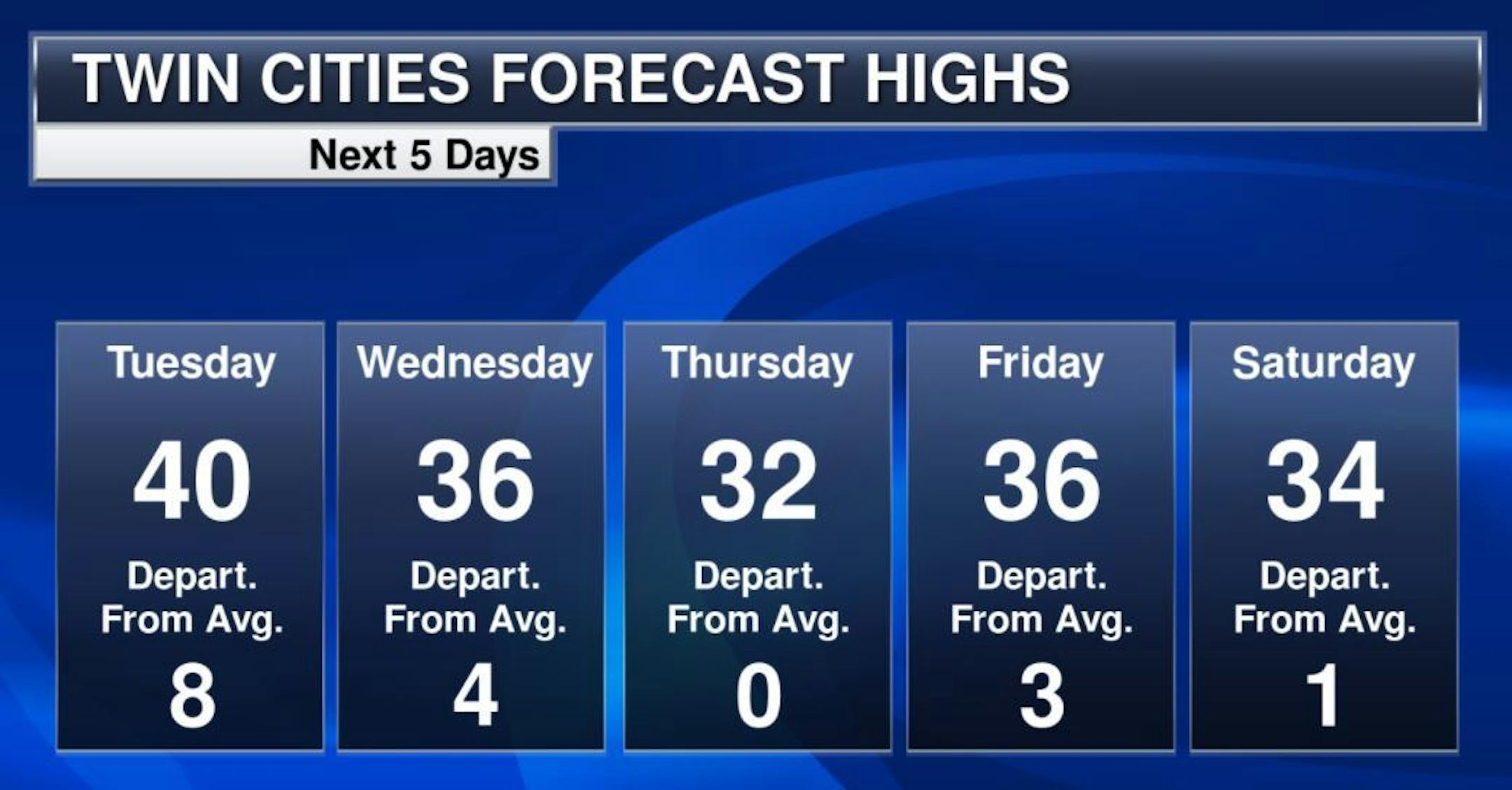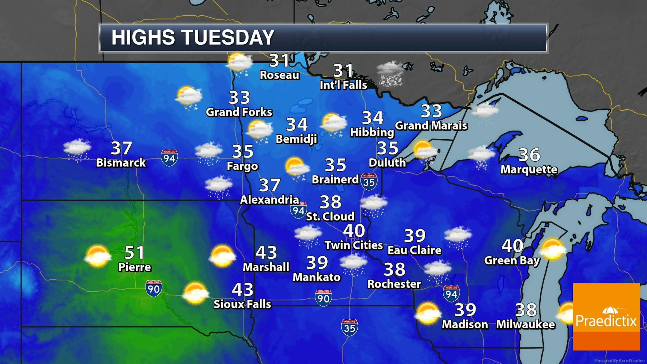 Here's the weather outlook across the region for Tuesday. Many locations across Minnesota will warm into the 30s, but a few low 40s can't be ruled out across the southern half of the state. These temps will be running nearly +10F above average, which is more typical of mid March.