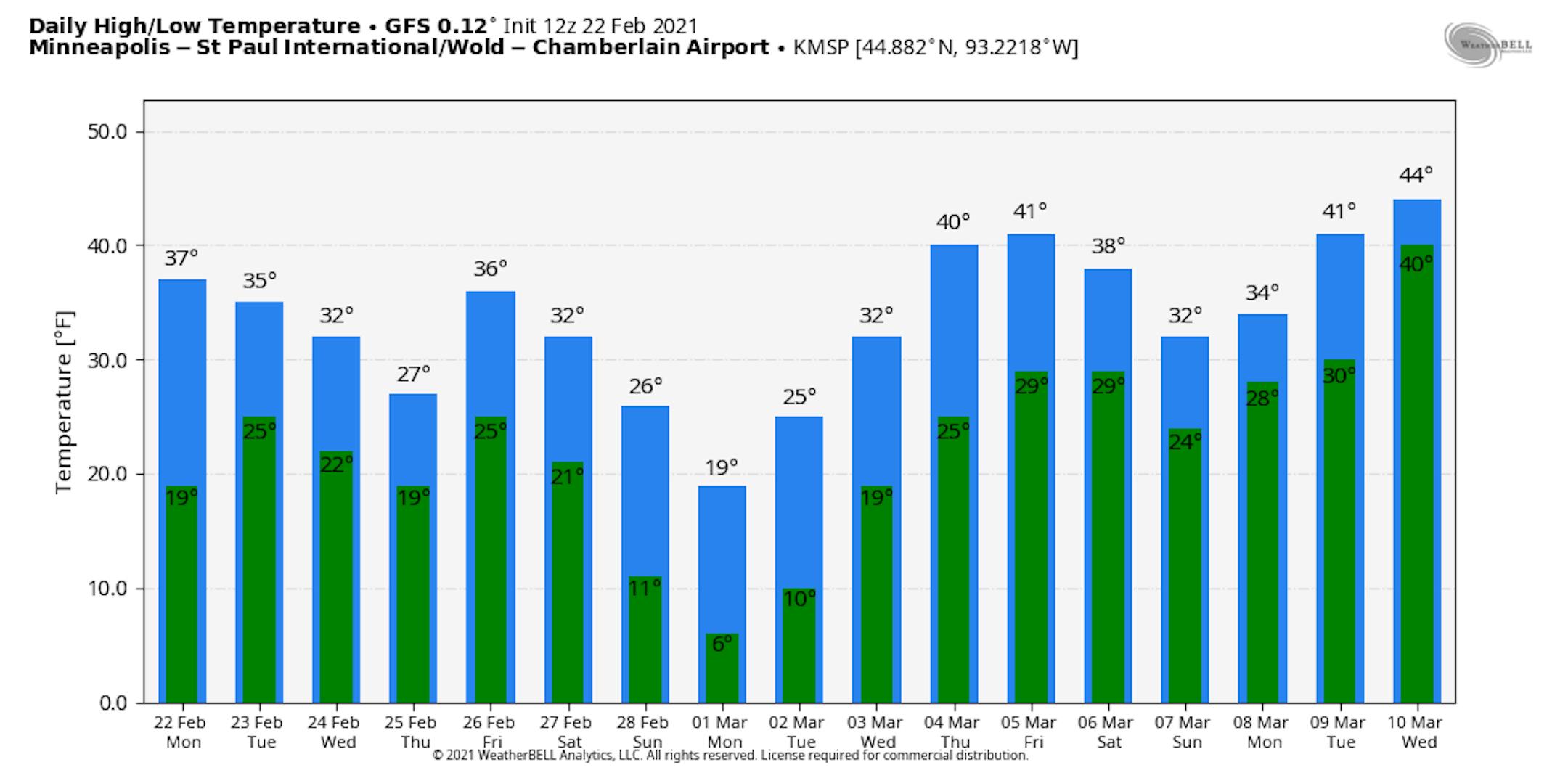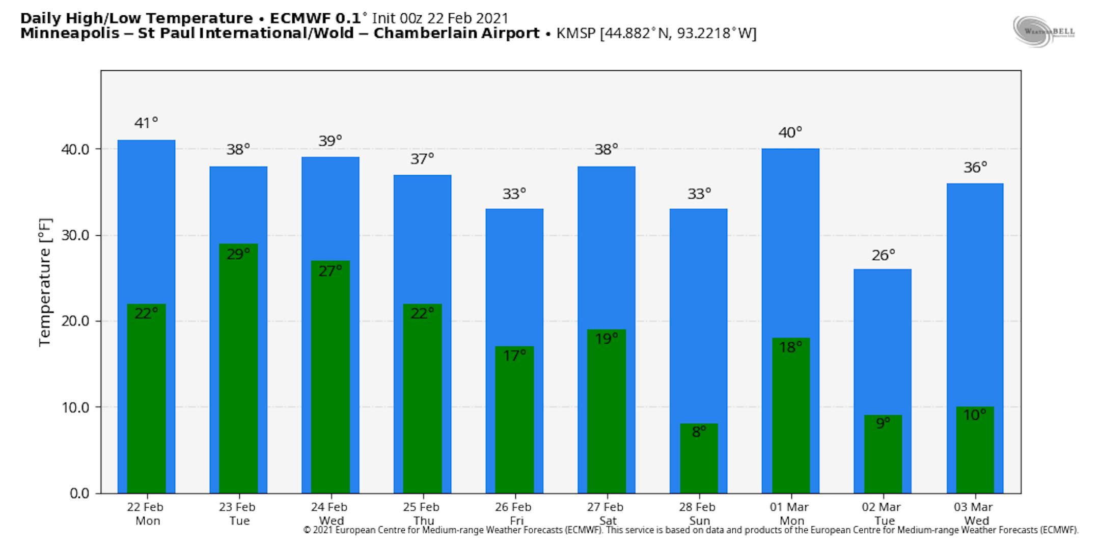 Here's the ECMWF & GFS extended temperature outlook for Minneapolis through the last few days of February and into early March. Note how much warmer it'll be over the next couple of weeks compared to how cold it was during the first half of February. Other than a slight dip in the temps late weekend/early next week, we're seeing more 30s and even a few 40s on the extended temperature map!