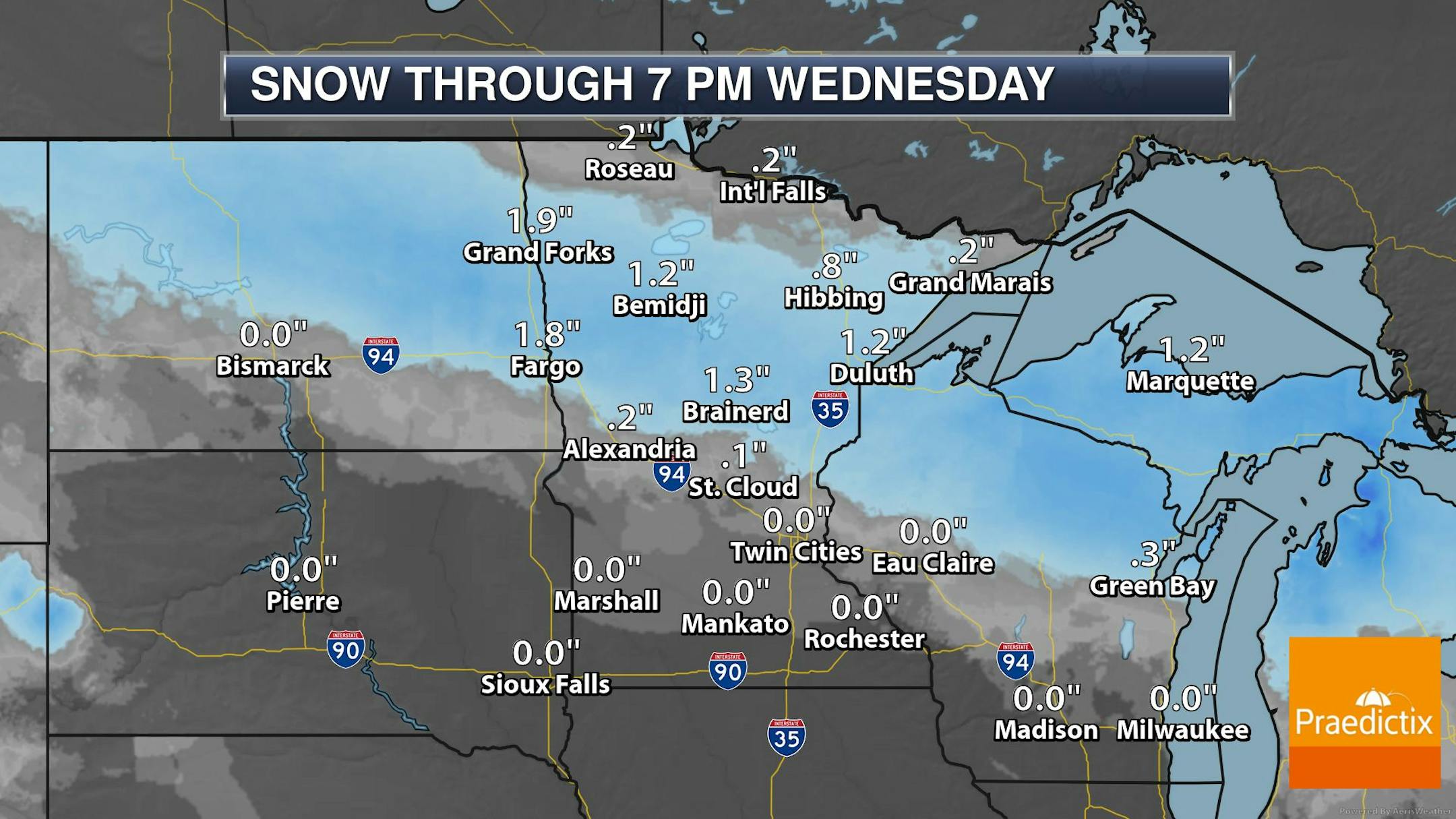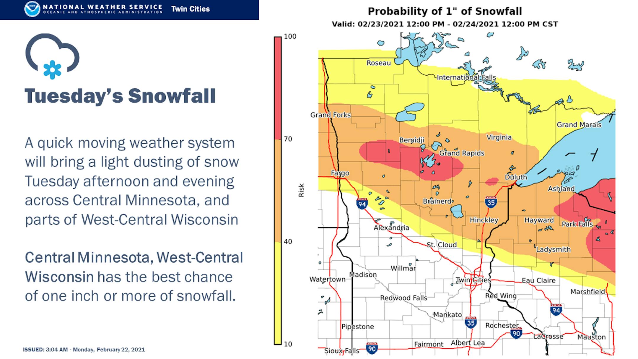 A fast moving clipper system will slide through the region late Tuesday with a chance of minor snow accumulations across parts of northern MN & Wisconsin. The best potential of 1" to 2" will be from the Fargo/Grand Forks area to Duluth and into northern Wisconsin. Again, the bulk of the precipitation will fall north of the Twin Cities, but don't be surprised if there are a few sprinkles or light snow showers later in the day.