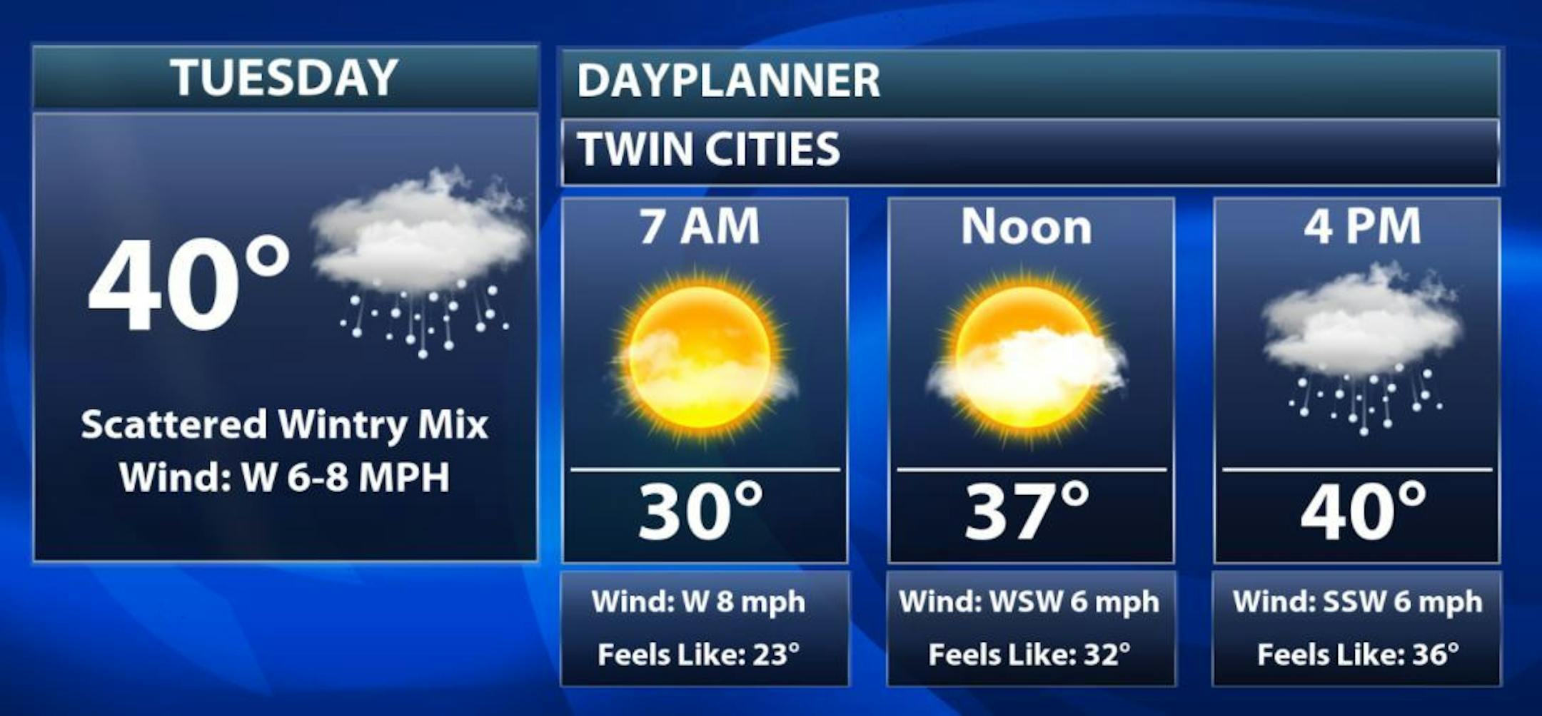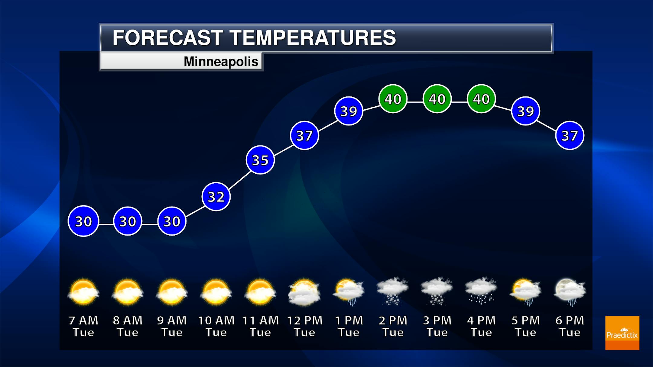 Here's the weather outlook for Minneapolis on Tuesday. Note how warm temps will be throughout the day. Highs could hit 40F once again with a light wintry mix possible later in the day.