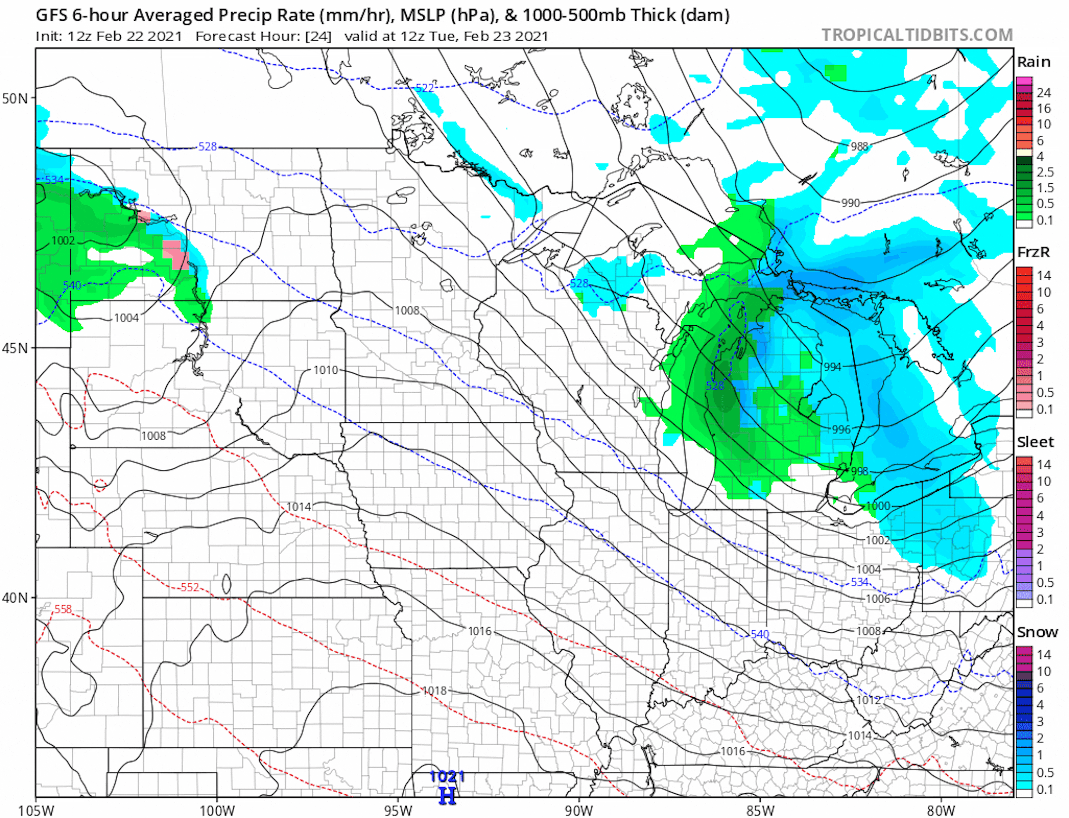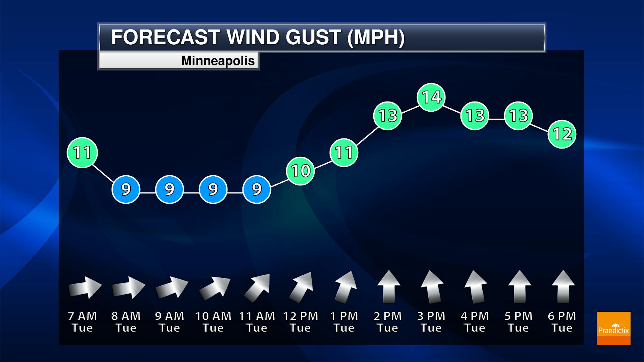 The meteograms for Minneapolis on Tuesday. Temps much of the day will be in the 30s, but could sneak up close to 40F by the afternoon with some light wintry mixed potential. South to southwesterly winds will increase through the day and could gust up to 15mph during the afternoon.