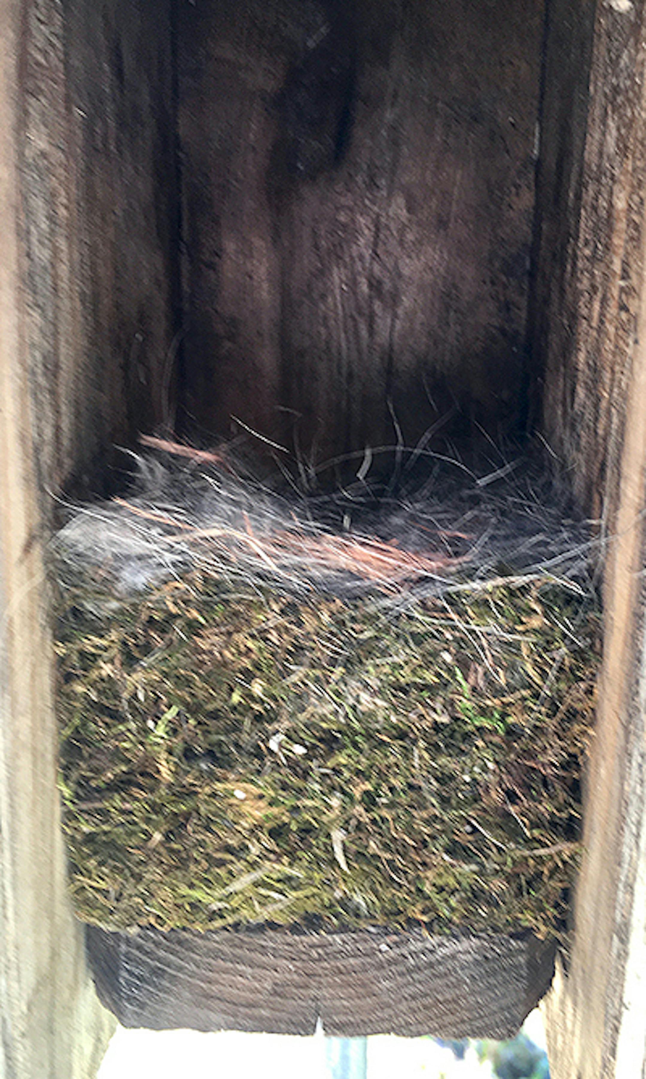 The box base is four inches square. The nest is three inches deep. That's 48 square inches of moss, all delivered by the chickadee(s), piece by piece.