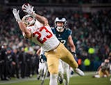 PHILADELPHIA — George Kittle's season was over, a torn right Achilles tendon for the star tight end that dampened the mood in a playoff win that kept the San Francisco 49ers in the hunt for a Super Bowl.