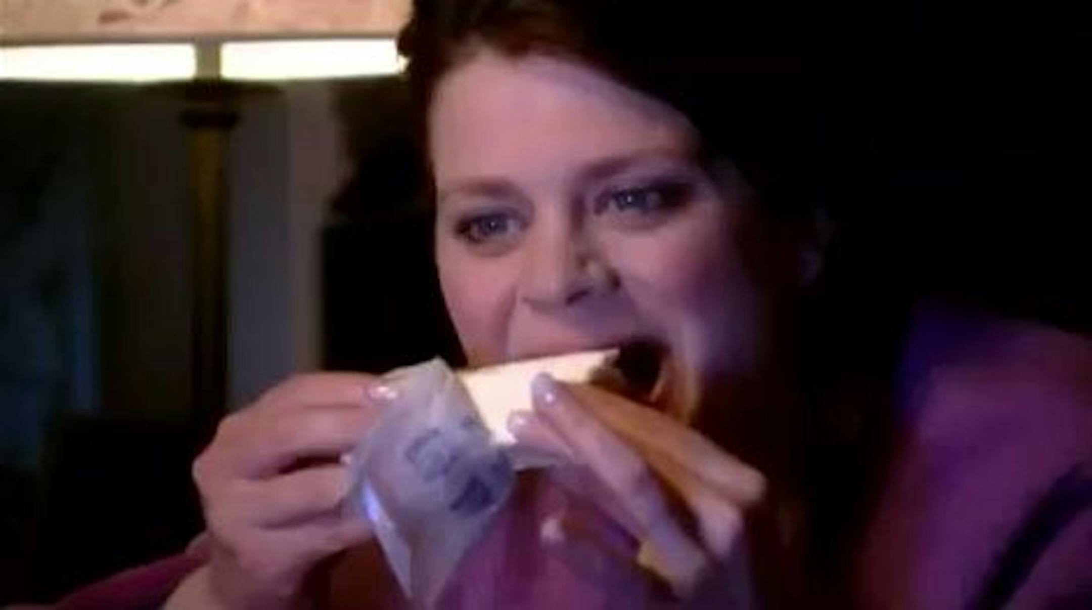 With the TV's blue screen flickering off her face, the woman treats the butter stick like her favorite source of food, licking her fingers, picking a dollop of spilled butter off her shirt in order to get every morsel.