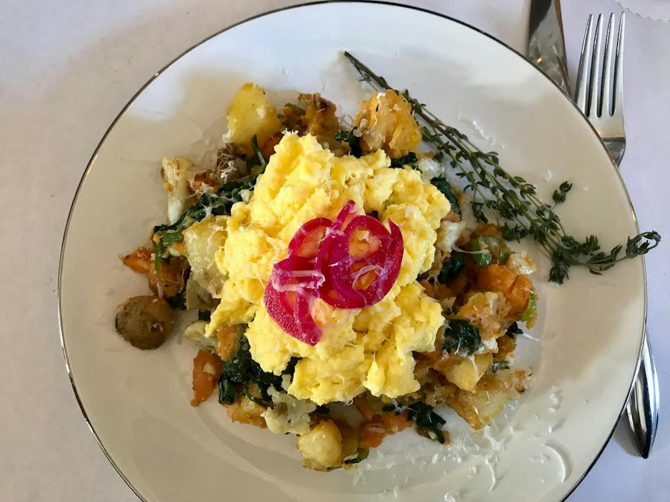 Hash with soft scrambled eggs at Chef Shack Bay City