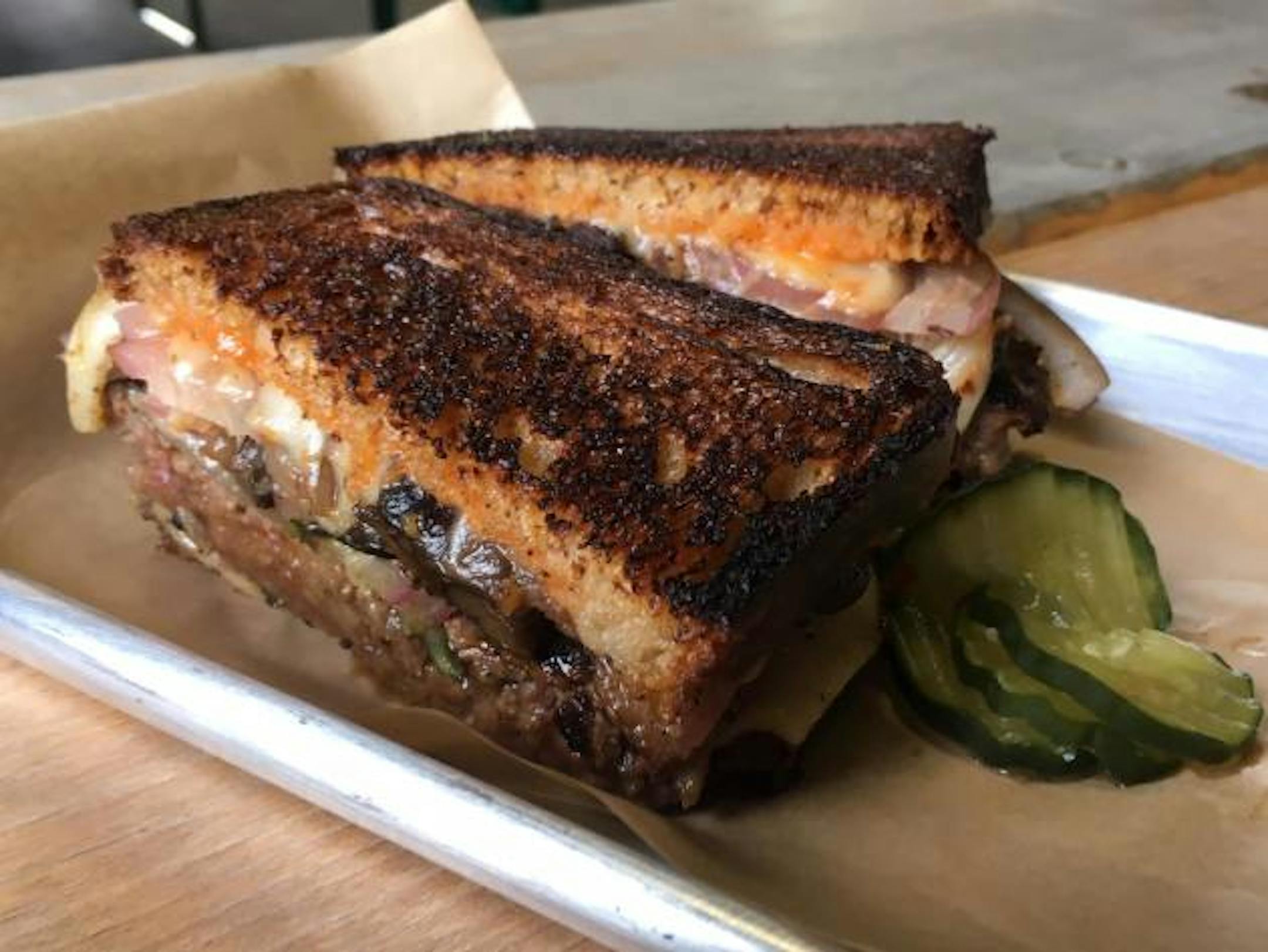 The burger: Chef Matt Sprague keeps burger fans happy with turkey burgers and lamb burgers, both on his daytime menu. On Thursday evenings, he channels his considerable burger-making talents in a more traditional direction – beef – and the results are spectacular. Sprague adheres to the popular double-patty formula, but not blindly; the sirloin-heavy patties are noticeably weightier than their counterparts on the diner-style skinny-patty spectrum ("Sometimes, when patties are smashed super-thin, they tend to dry out," said Sprague). Condiments squarely land in the "restrained" camp, which keeps this quality beef (from Peterson Craft Meats) at the forefront: shredded iceberg lettuce, house-made bread-and-butter pickles that own the "right-on-the-money" label, a few slices of American cheese (with backbone-strengthening boosts from a smoky Gouda and a funky blue cheese), and a Russian dressing-like sauce that brazenly cranks up the umami quotient. The toasty, buttered-up brioche bun, baked on the premises, is nothing short of perfect.