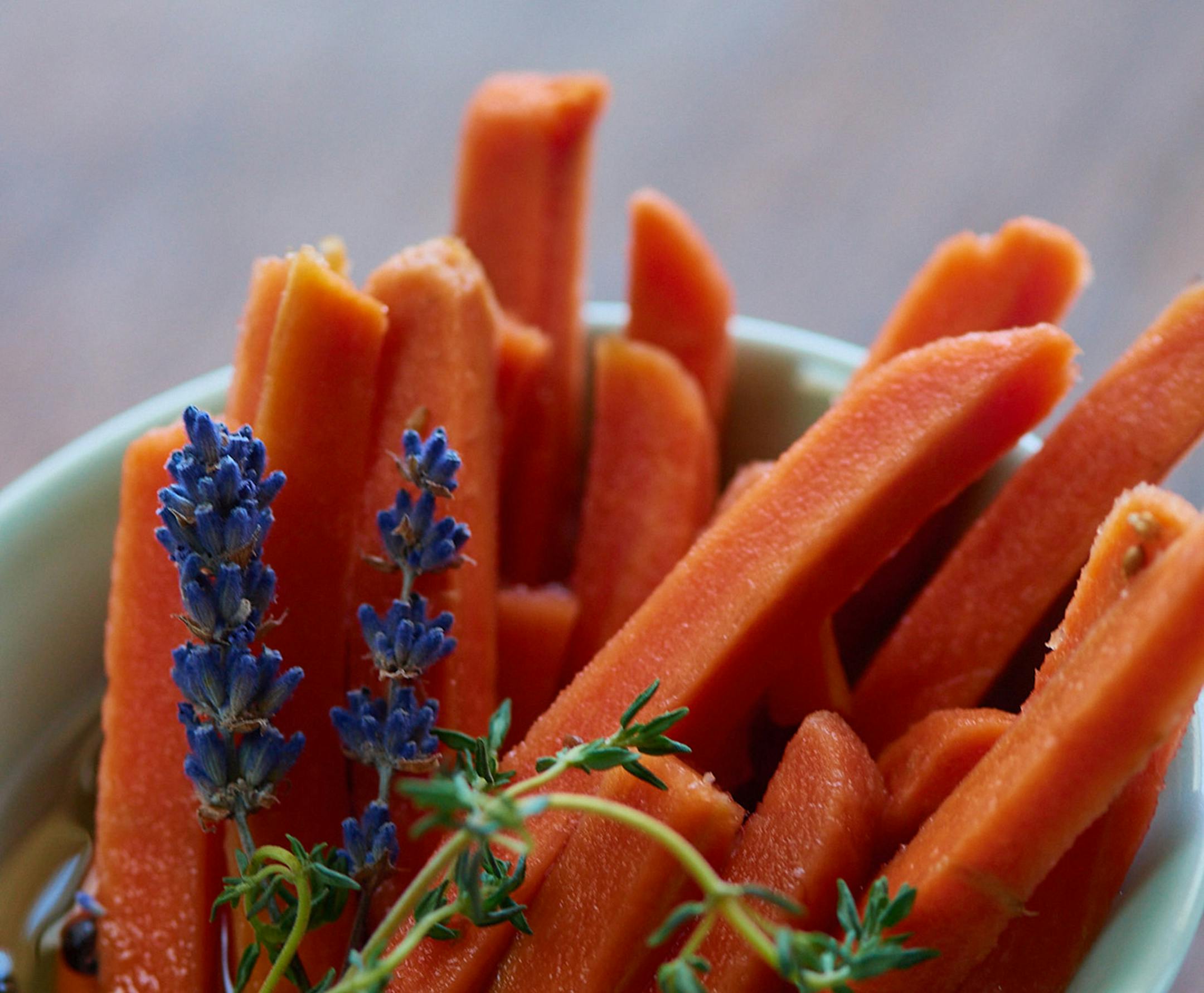 Divide the lavender and thyme sprigs between 2 sterilized wide-mouth pint jars. Pack in the carrots, trimming the ends as needed, leaving a little more than ½-inch headspace.