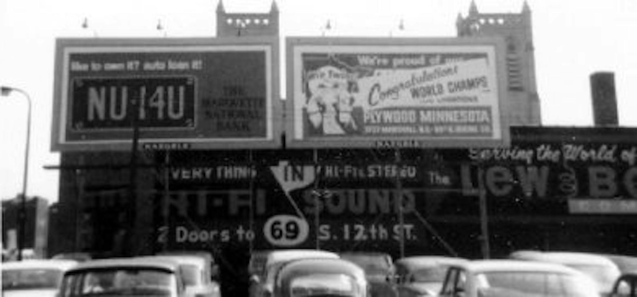 *First, check out this shot of a billboard that was on 13th and LaSalle, according to Anderson. It's basically a half-century-ago version of the errant tweet sent out by the Texas Governor's office account the other day because as you can see it says "Congratulations World Champs." If Anderson's timeline is correct and this photo is from the day of Game 7, presumably hours before the game itself at Met Stadium, that billboard amounts to a pretty hefty jinx if you believe in such things. The home team had won all six games in the series heading into the deciding contest, but Sandy Koufax spun a shutout for a 2-0 Dodgers win.