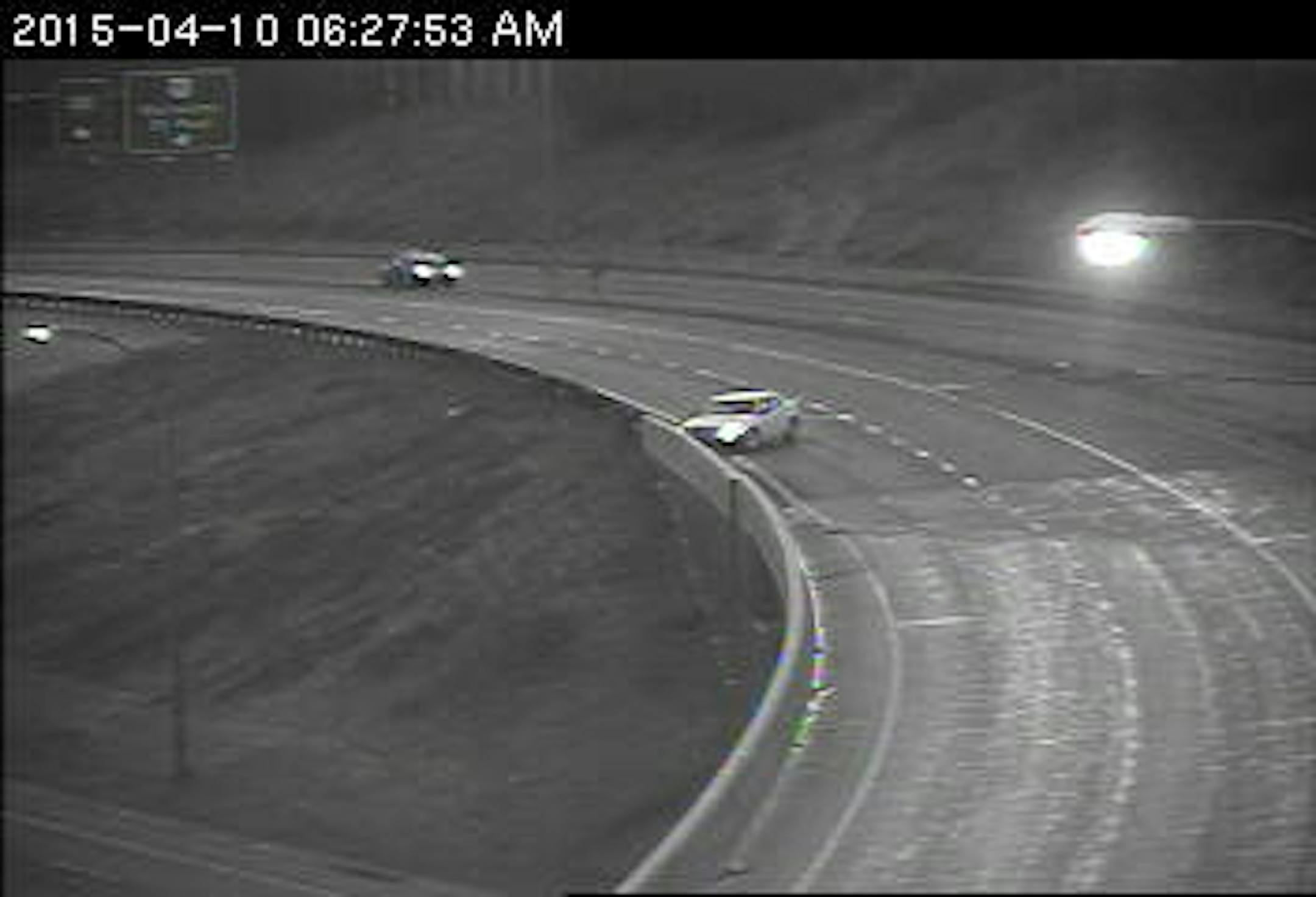 Friday's morning rush hour is off to a slippery start as witnessed by a number of spin outs on ramps and bridge decks. This one is blocking a lane on westbound I-494 at Hwy. 110.
