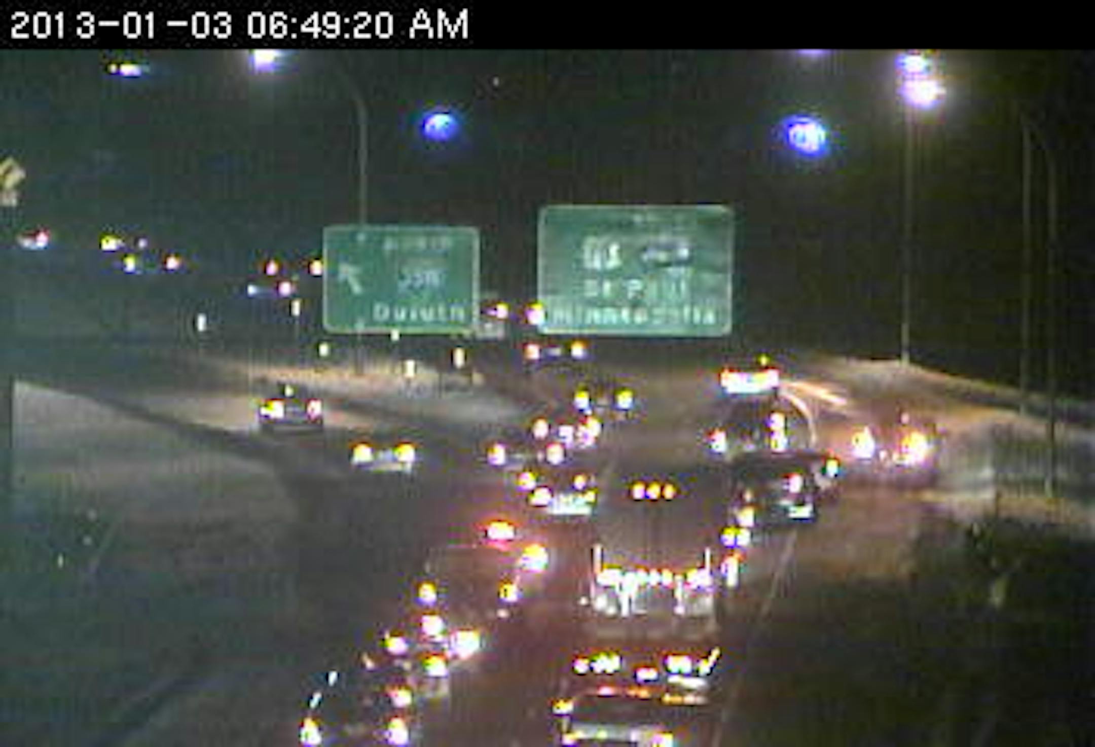 A couple vehicles are off to the right shoulder on the ramp from eastbound Hwy. 10 to southbound 35W.