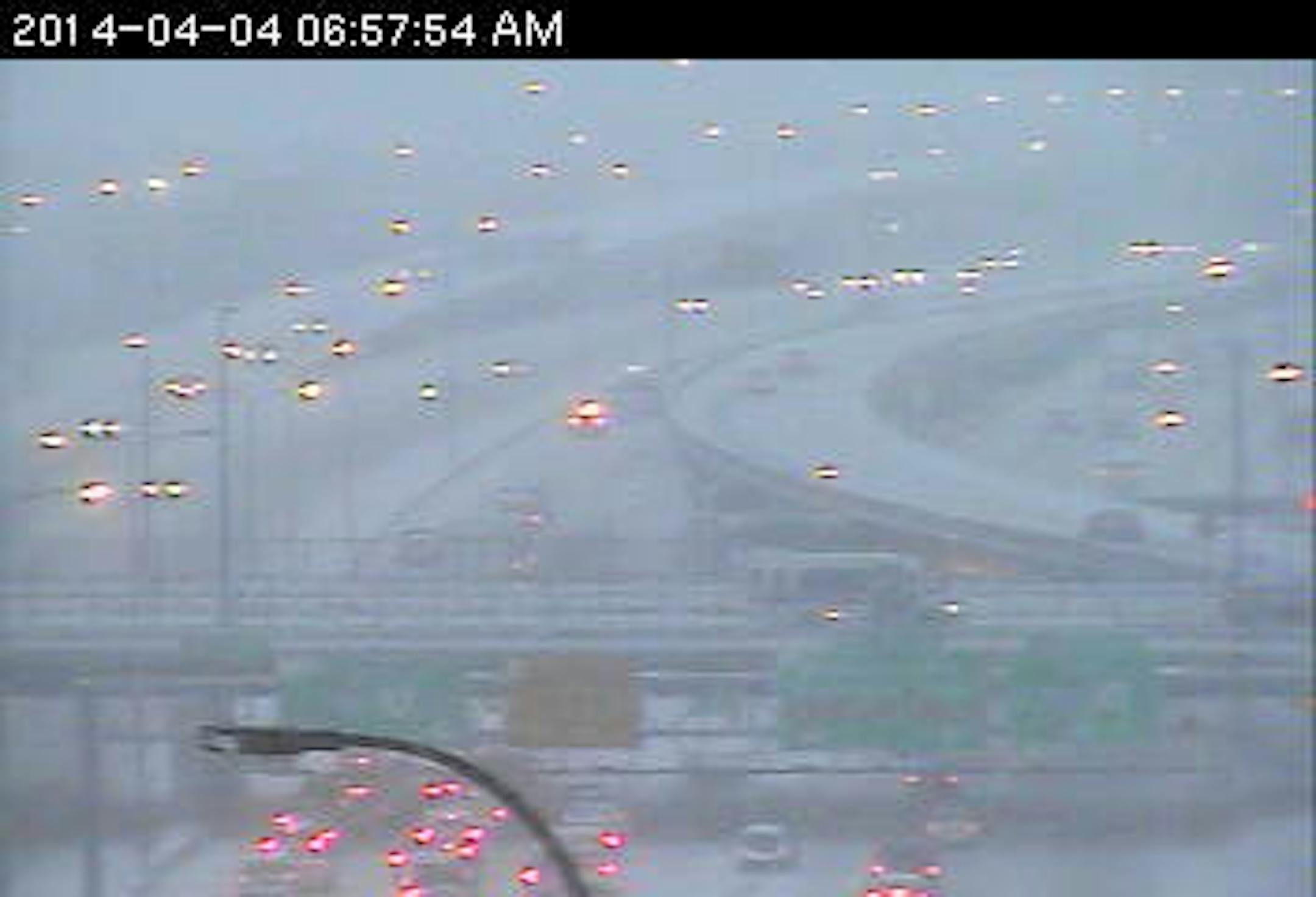 On westbound 694, a semi is having trouble getting up the icy incline near Silver Lake Road. Traffic is getting by on the left lane and shoulder.