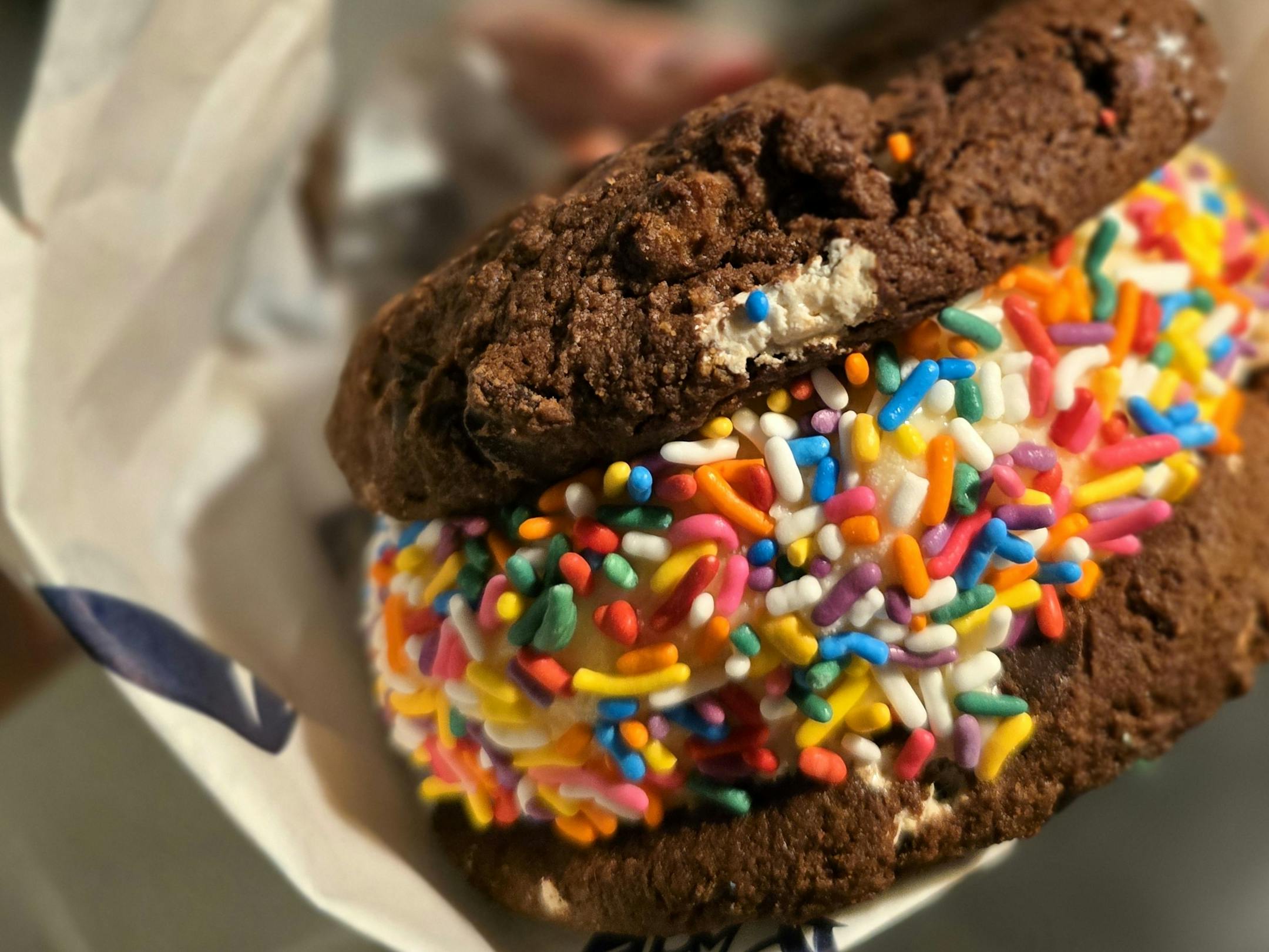 We wish we had a scale to weight this monster, which is built from two huge chocolate cookies studded with marshmallow and graham cracker bits. The vanilla soft serve is hardened by a deep chill in the freezer, and rainbow sprinkles are a happy touch.