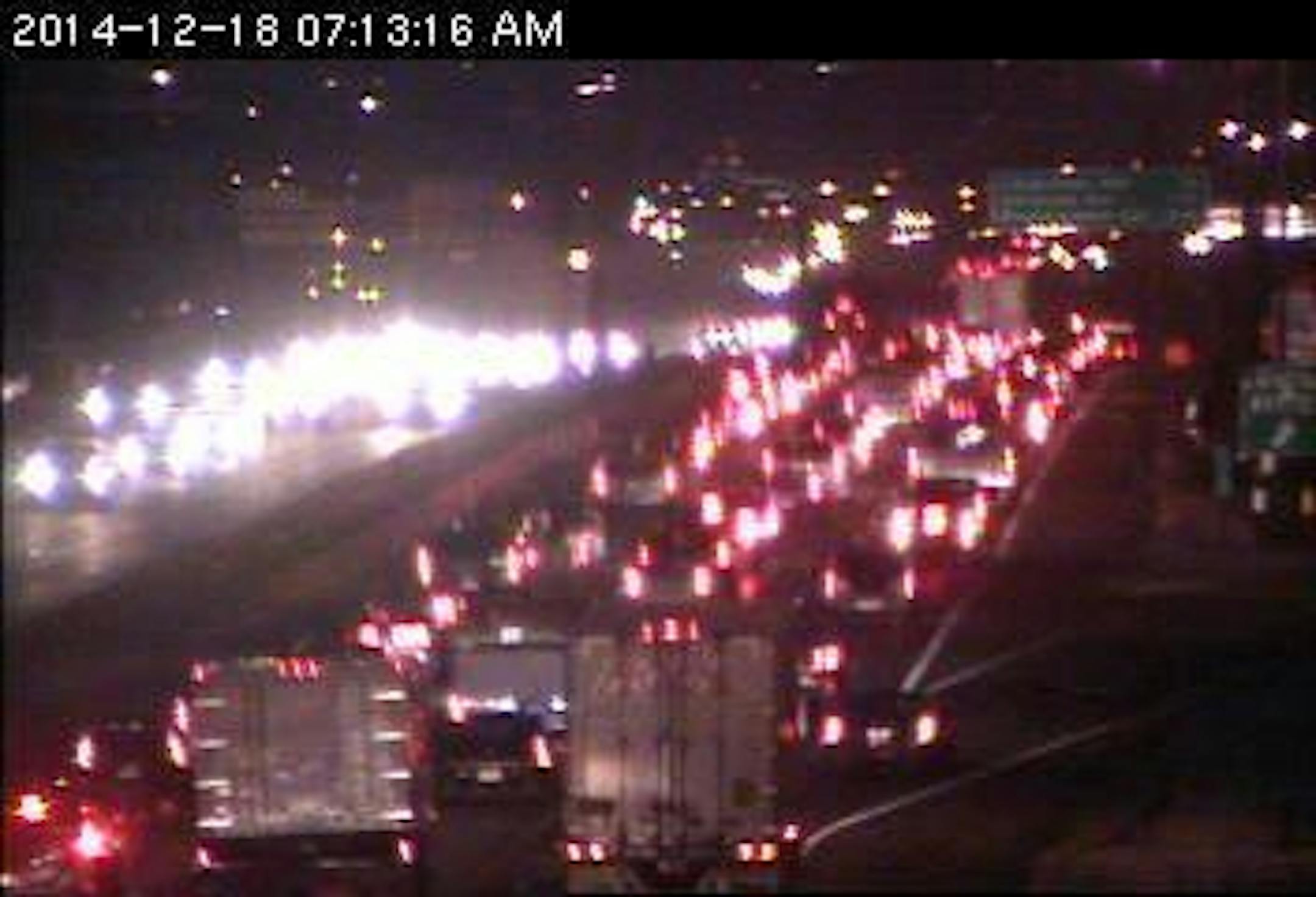 This traffic jam on southbound 35E is the result of a short-lived crash ahead at Pennsylvania Avenue. The wreck has cleared, but obviously the congestion has not. The line up begins near Little Canada Road.