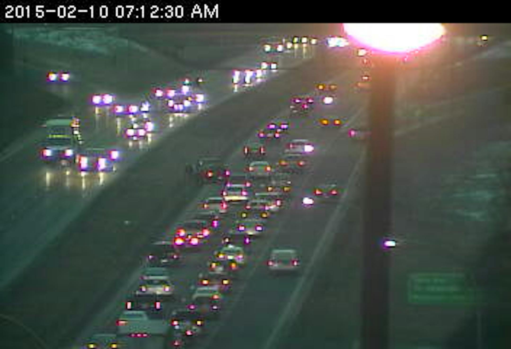 In St. Paul, a wreck at 7th Street has westbound 94 traffic slowing at White Bear Avenue. The wreckage and debris has been moved to the right shoulder.