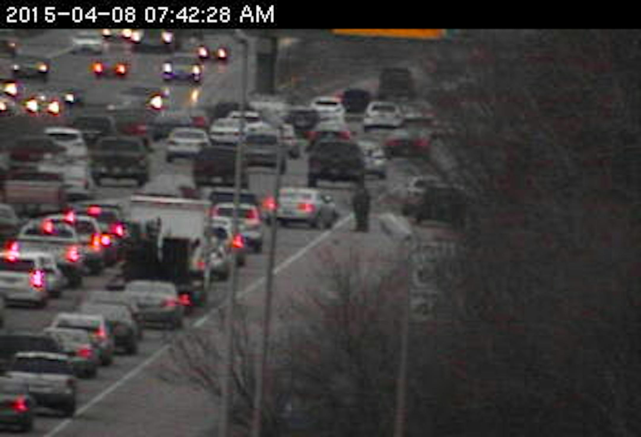 Ahead, look for a pickup on the right shoulder at County Road C and the trailer it was towing on the left shoulder. Traffic crams up at County Road E2.
