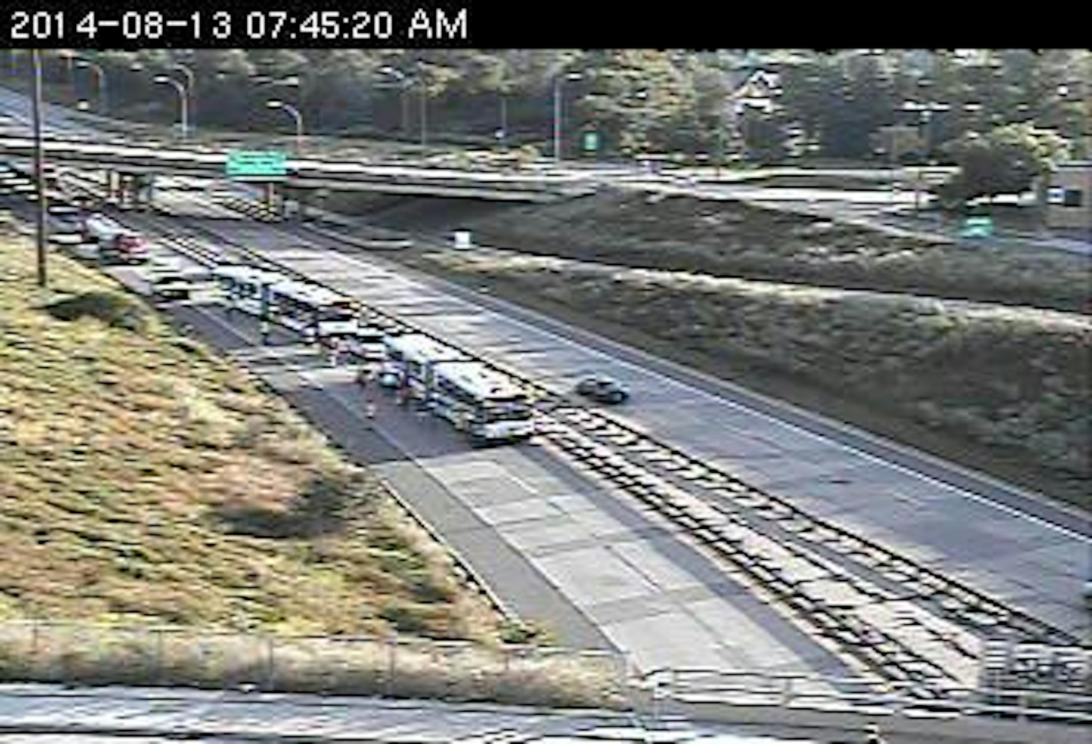 Traffic is stopped on southbound Hwy. 280 as passengers transfer from one stalled bus to another. The stoppage begins at Broadway.