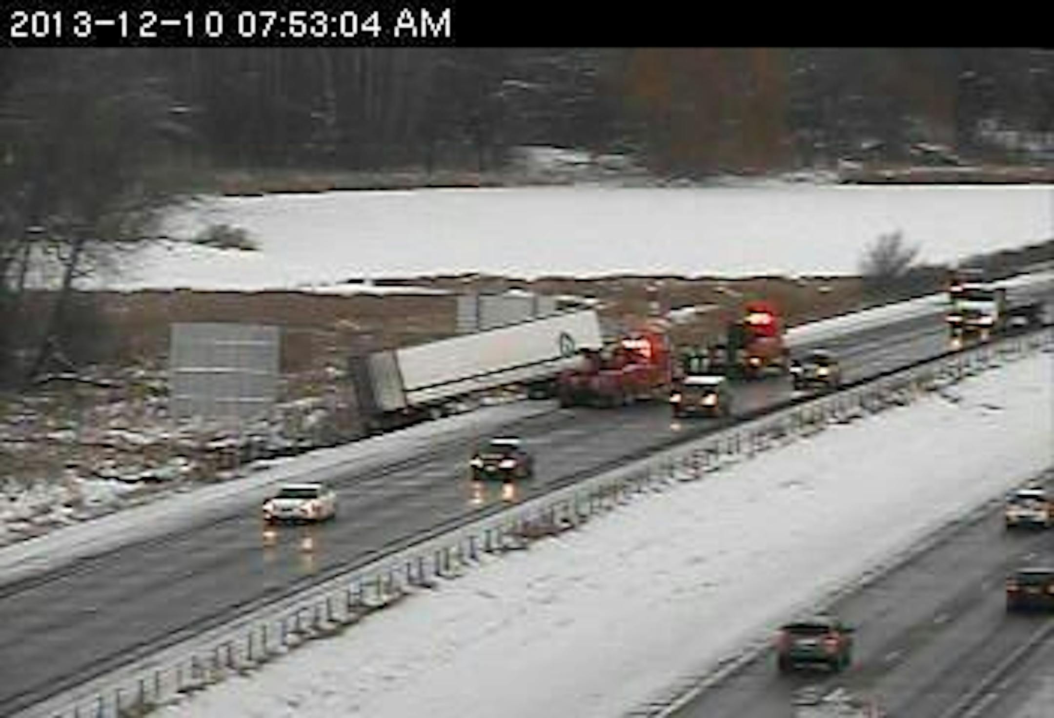 A jackknifed semitrailer truck landed in the right ditch on southbound I-35 at 195th Street in Lakeville. Northbound traffic is running well below the posted speeds from there up to the 35E/W split.