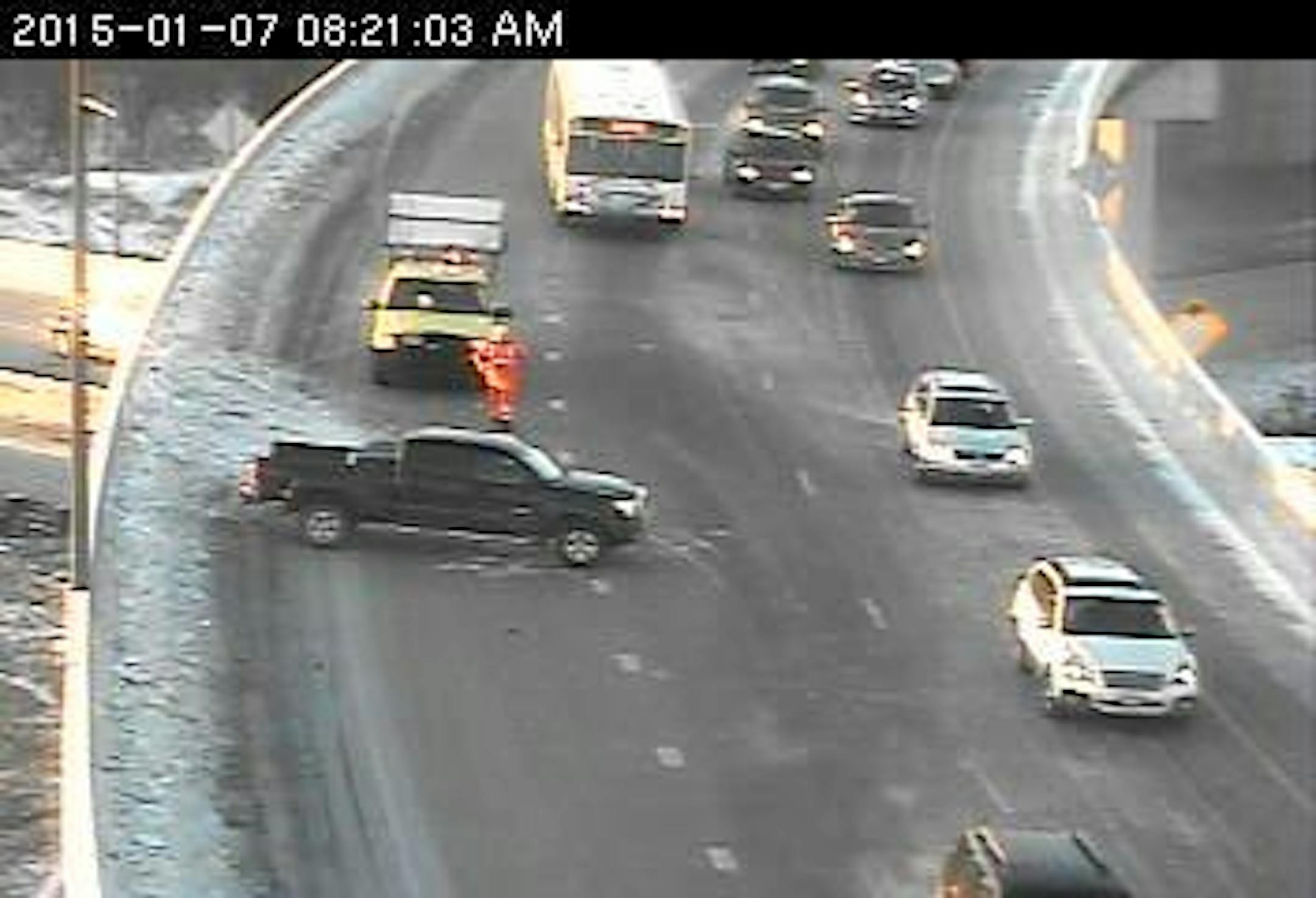 Black ice is possible on bridge decks, and that might be the reason this pickup driver spun out on the ramp from eastbound I-94 to northbound 35E.