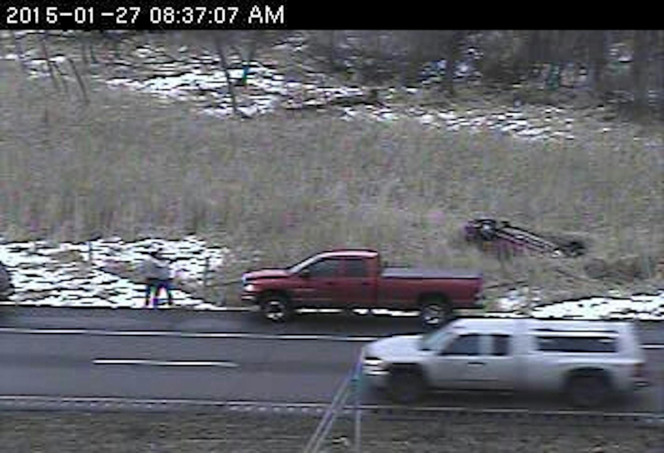 Initial reports indicated that one person is trapped in a vehicle that rolled over and landed in the right ditch on its roof. Passersby have stopped to help.